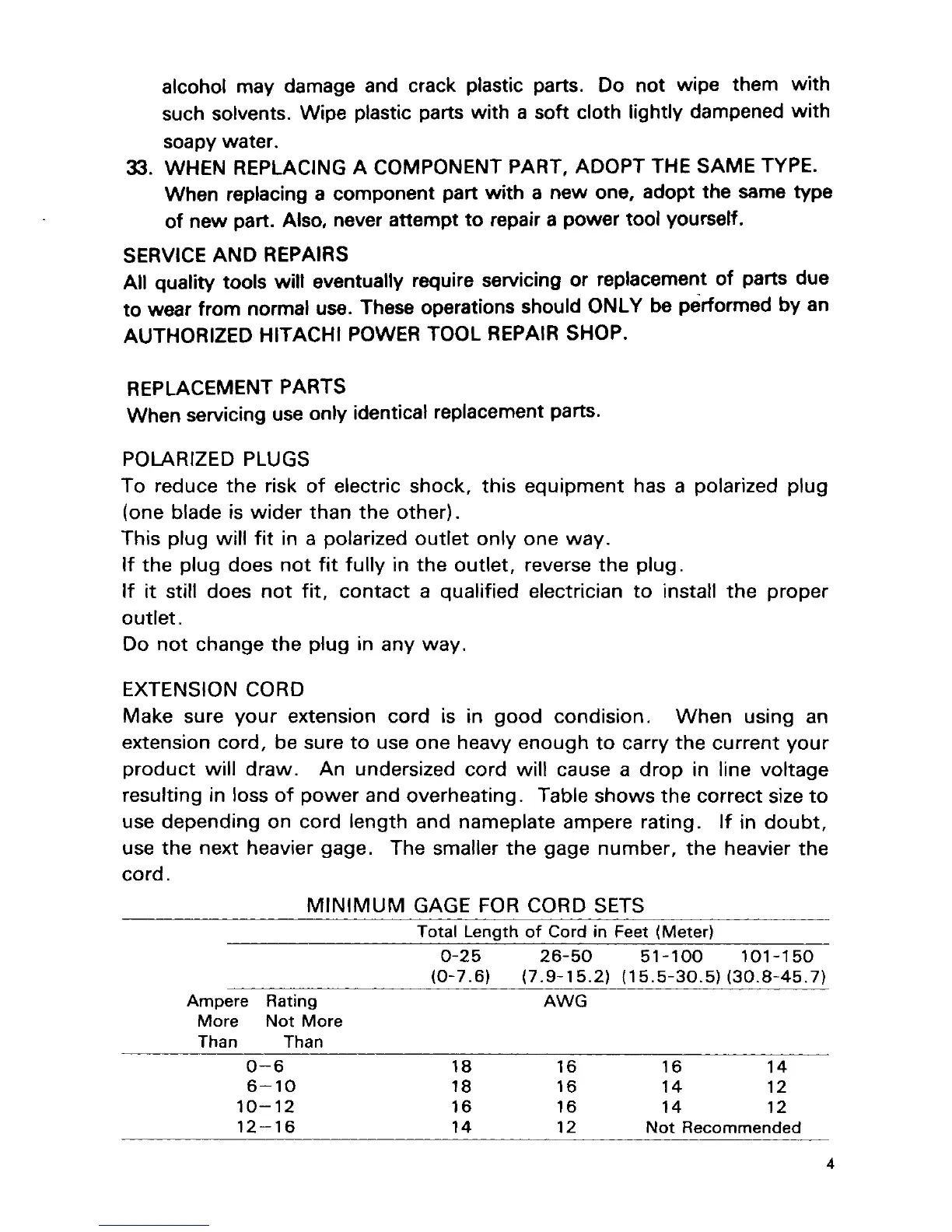 Hitachi M12V - Service and Repairs; Part Replacement and Cord Safety