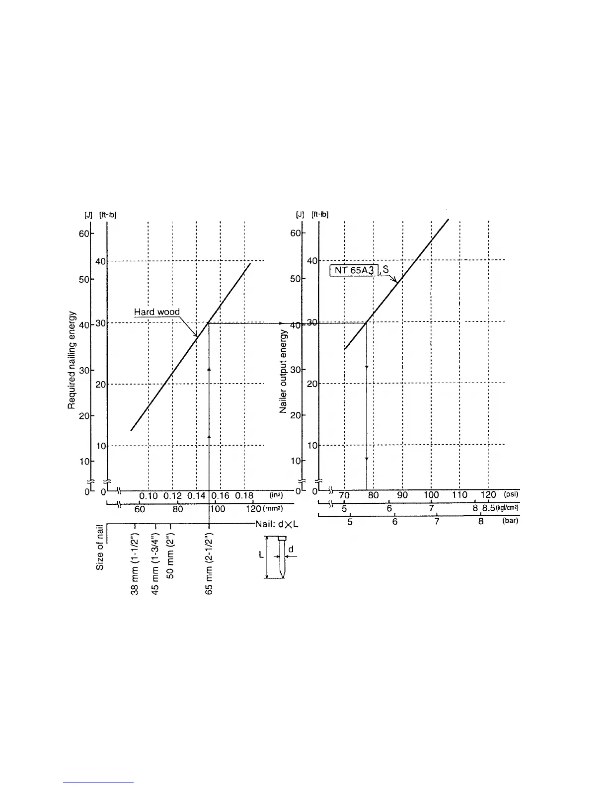 Figure 2 shows the nailer output energy provided by the supply pressure and the required nailing energy for