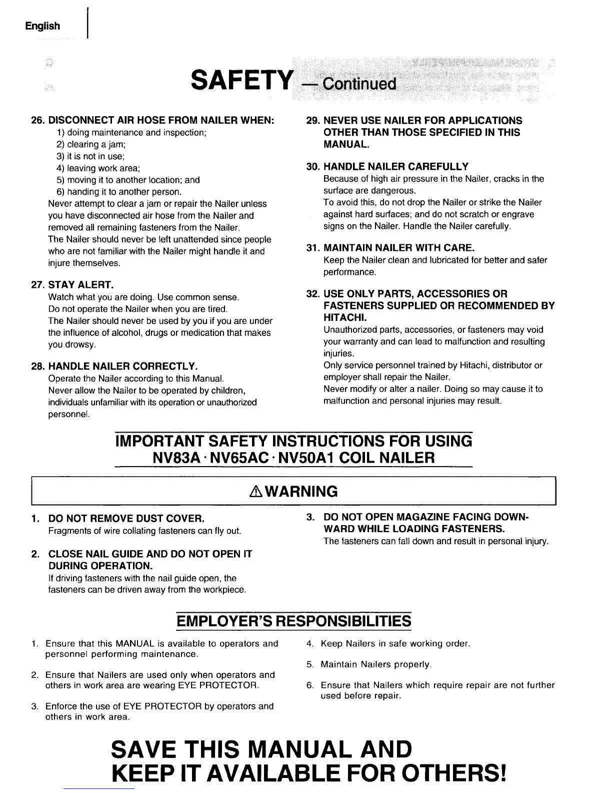 Hitachi NV 83A - IMPORTANT SAFETY INSTRUCTIONS FOR USING NV83 A NV65 AC NV50 A1 COIL NAILER