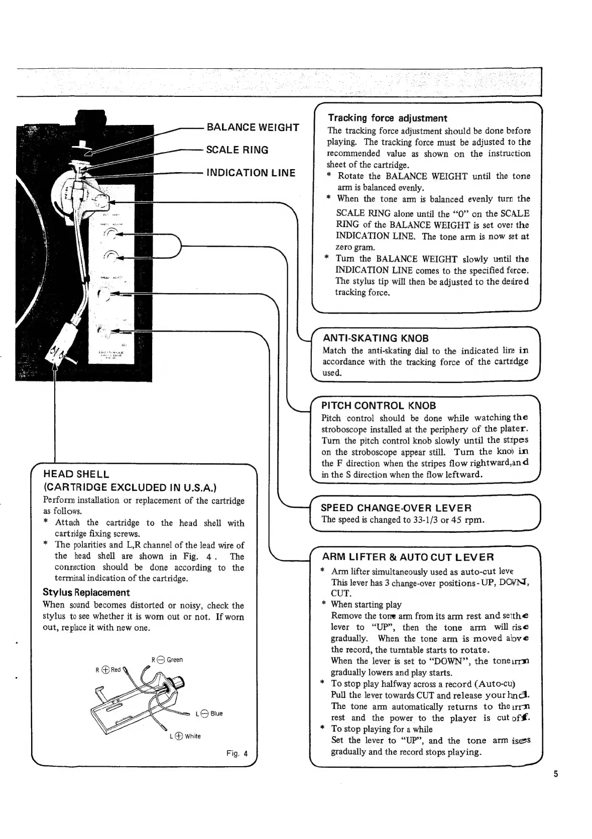 Hitachi PS-48 - Tracking Force and Anti-Skating Setup; Head Shell and Stylus Maintenance; Pitch Control Knob Operation; Arm Lifter and Auto Cut Lever Functions