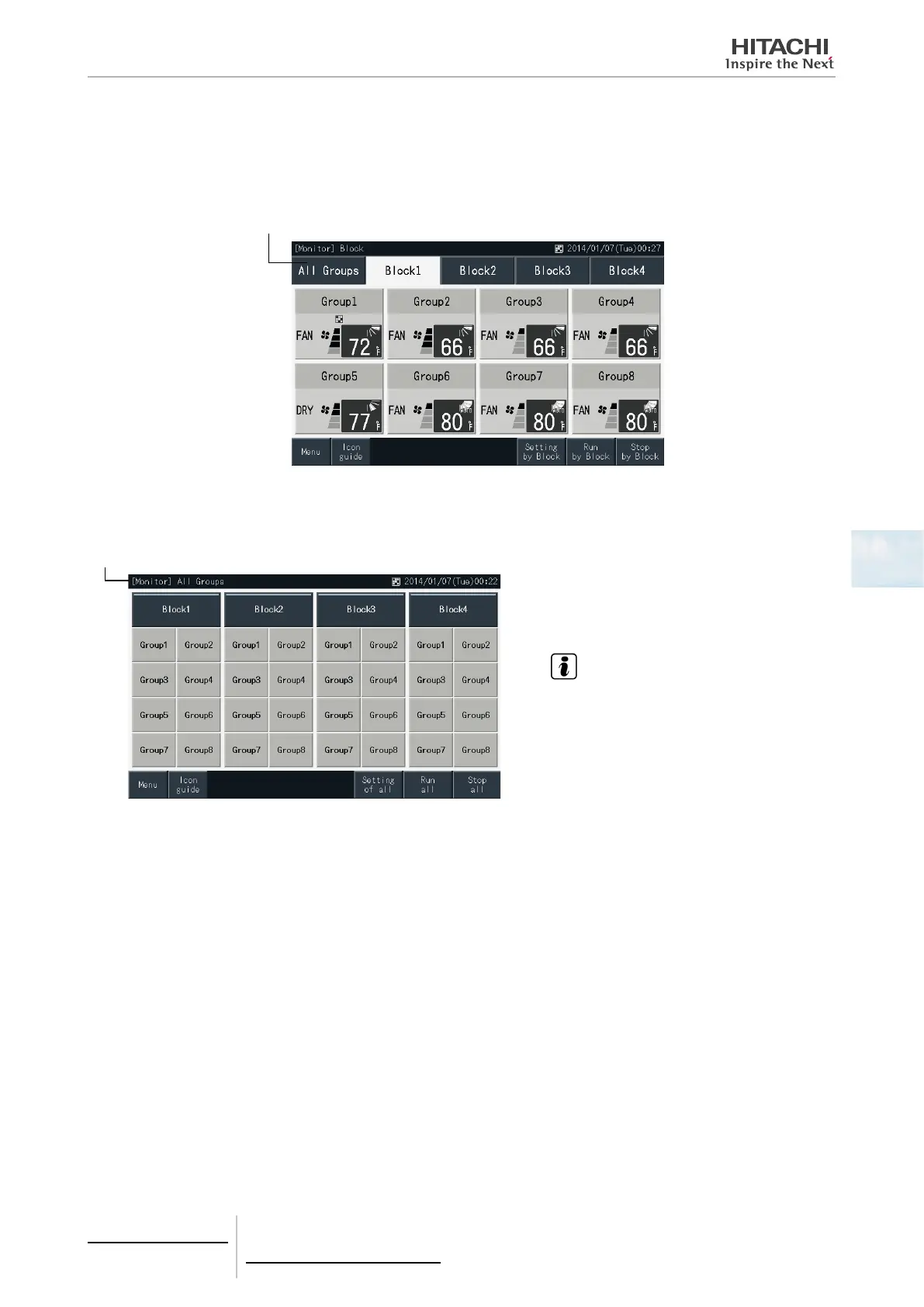 All groups are displayed on the touchscreen (all the indoor units connected to the central station are shown). The