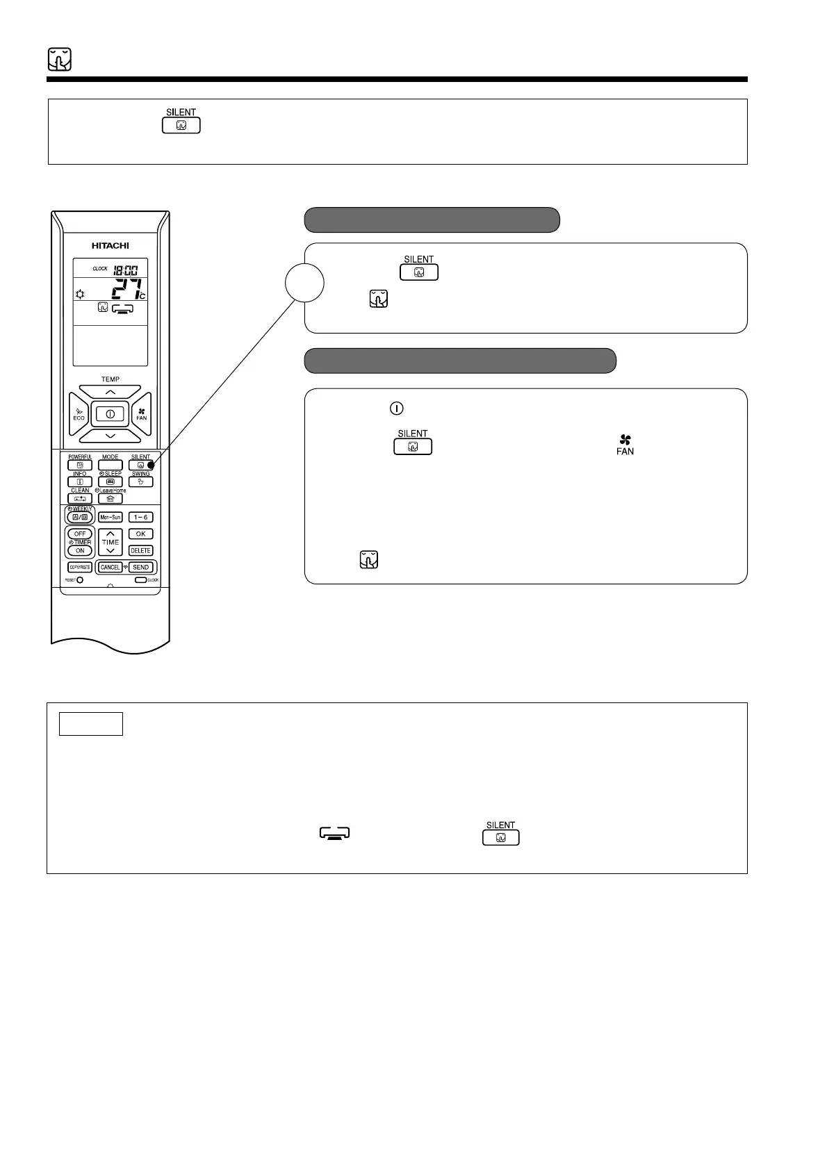 ● By pressing (SILENT) button during AUTO, HEATING, DEHUMIDIFYING, COOLING or FAN