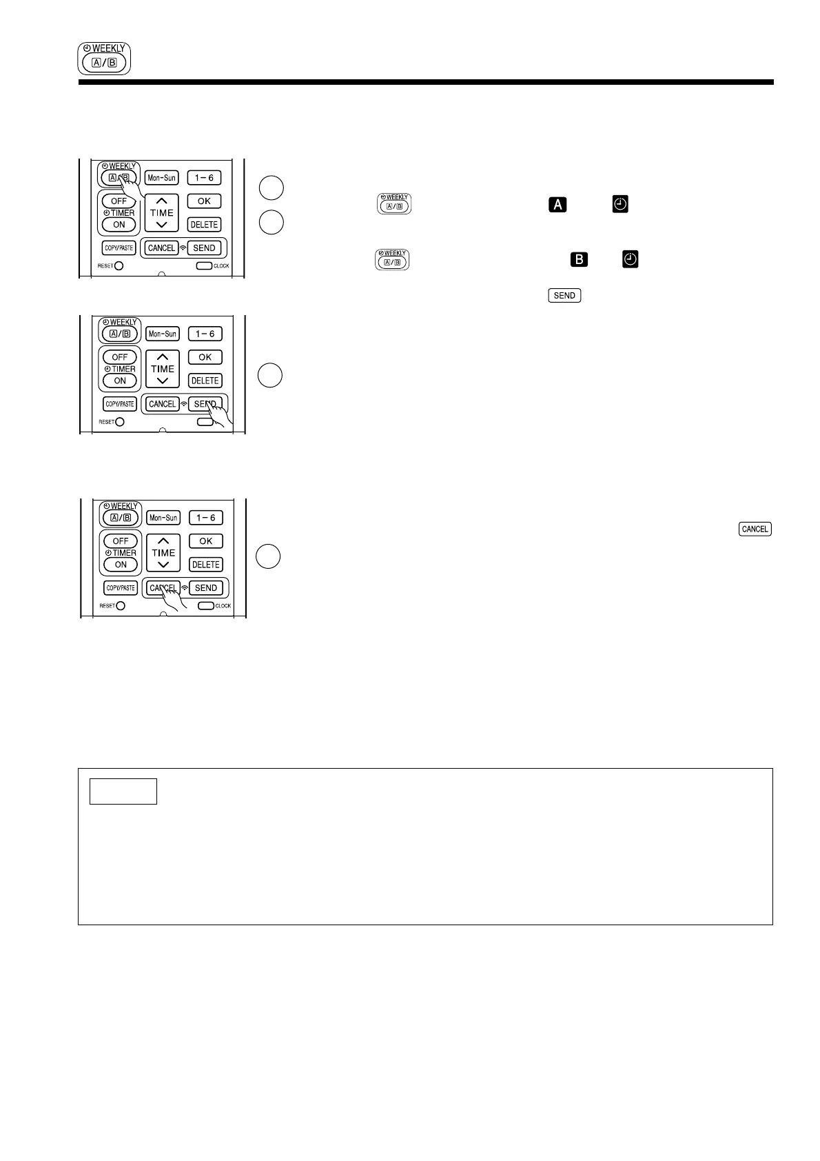 ● When ONCE TIMER is cancelled, operation of WEEKLY TIMER is also cancelled. Need to set WEEKLY