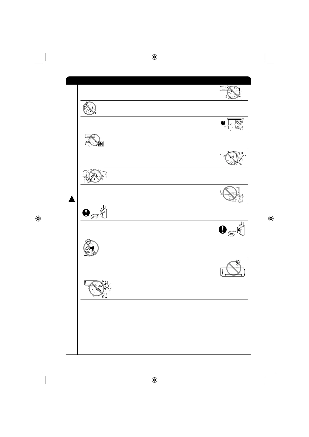 ● Do not put water container (like vase) on the indoor unit to avoid water