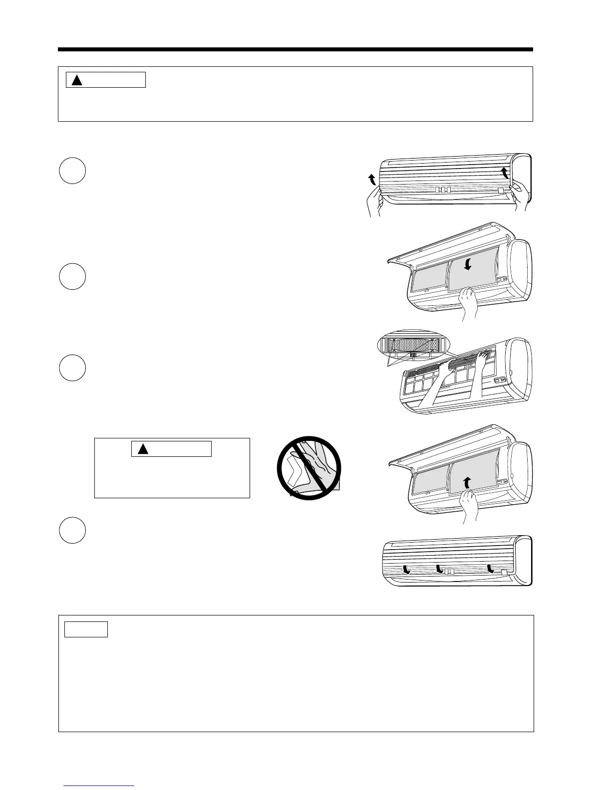 ● Do not operate the air conditioner without filter. Dust may enter the air conditioner and fault may occur.