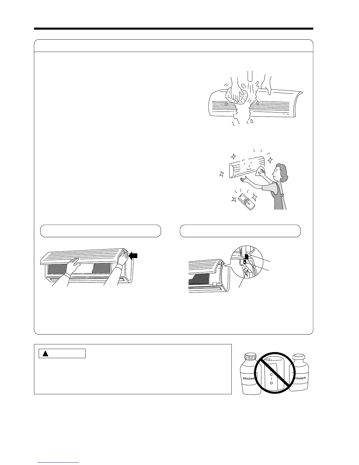 ● Never use hot water (above 40°C), benzine, gasoline, acid, thinner or