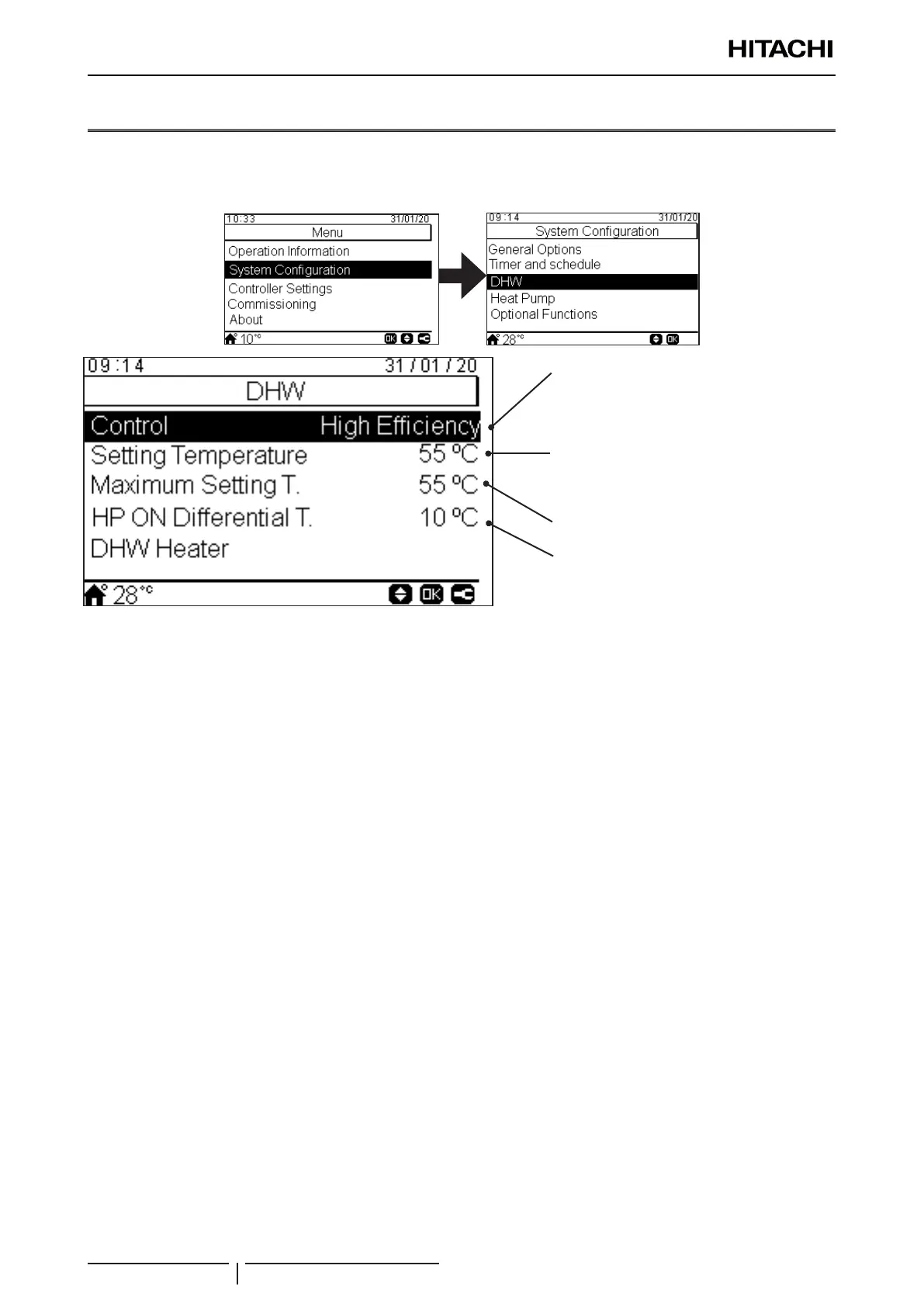 Setting for domestic hot water temperature selected