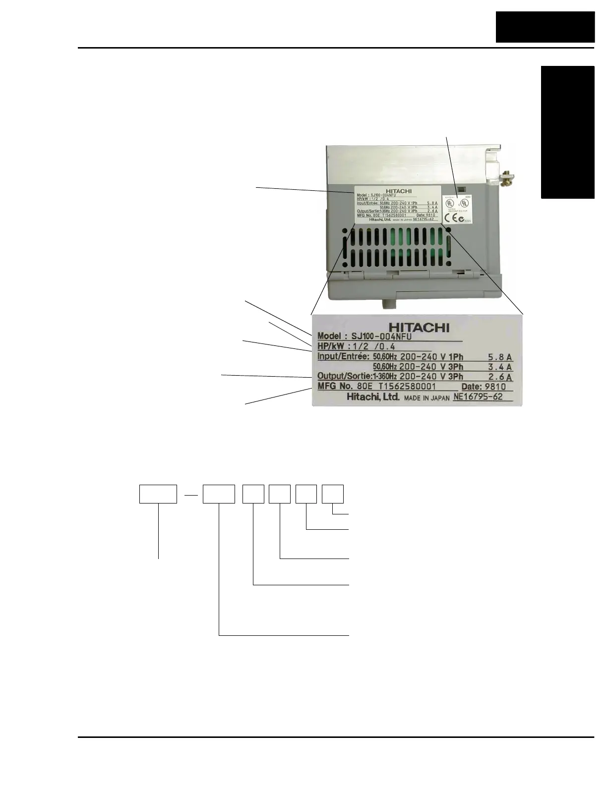 The Hitachi SJ100 inverters have product labels located on the right side of the housing,