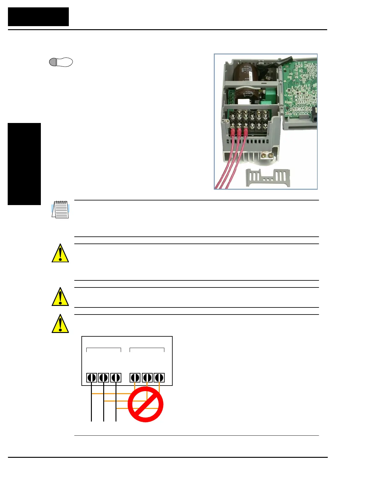 CAUTION: Be sure not to input a single phase to a three-phase-only type inverter.