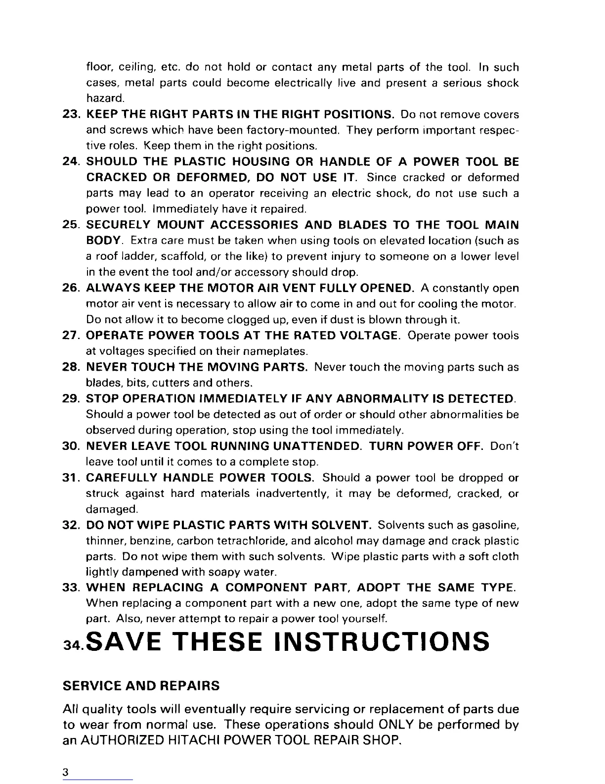 Hitachi SP18V - Keep Right Parts In Right Positions; Do Not Use Cracked or Deformed Housing; Securely Mount Accessories and Blades; Keep Motor Air Vent Fully Opened