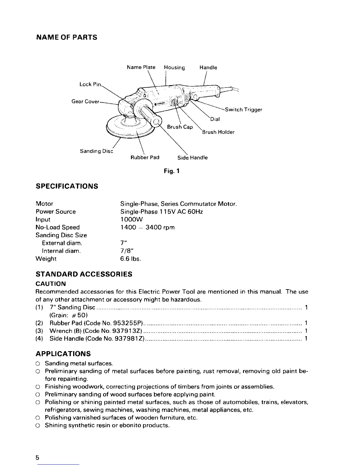 Hitachi SP18V - Specifications; Motor Specifications; Disc and Weight Specifications; Standard Accessories