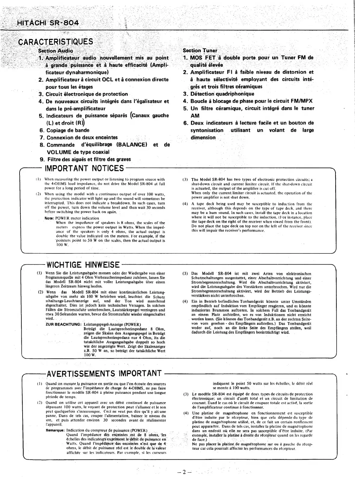 Hitachi SR-804 - IMPORTANT NOTICES