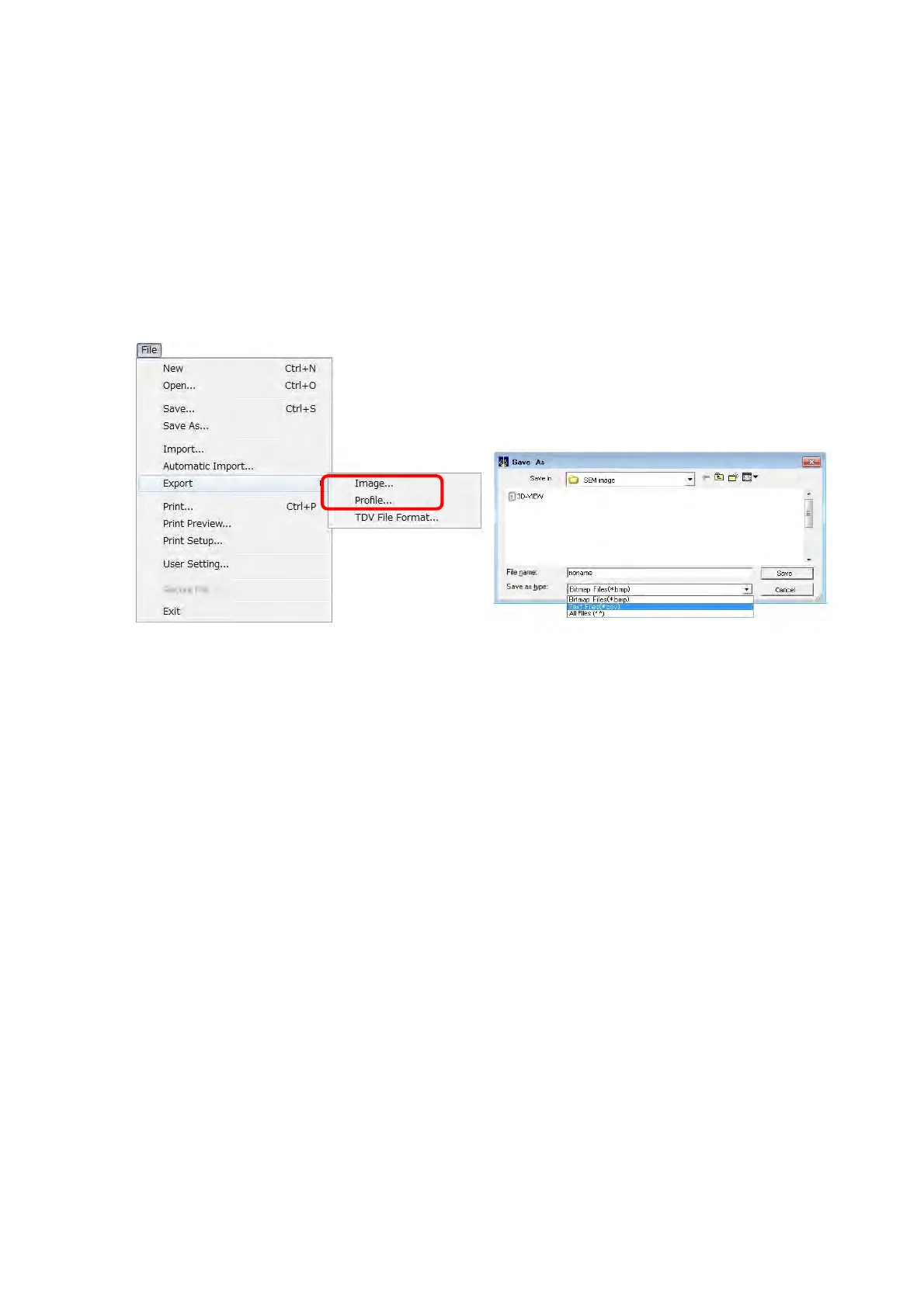 Select the [Image] or the [Profile] from the [Export] of the [File] menu in order to save the text