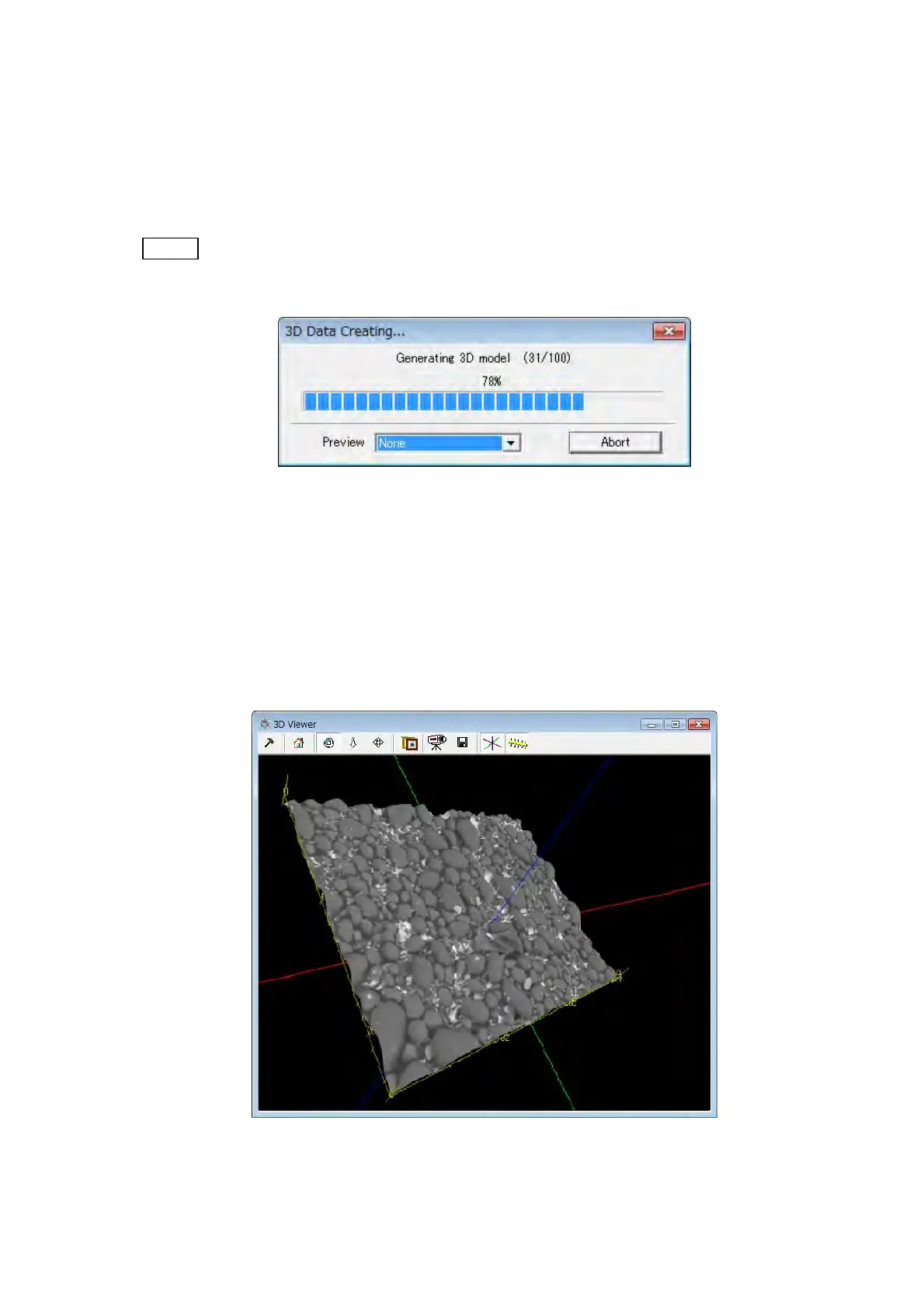 Creating 3D model is started and the 3D Data Creating dialog is displayed. Push the