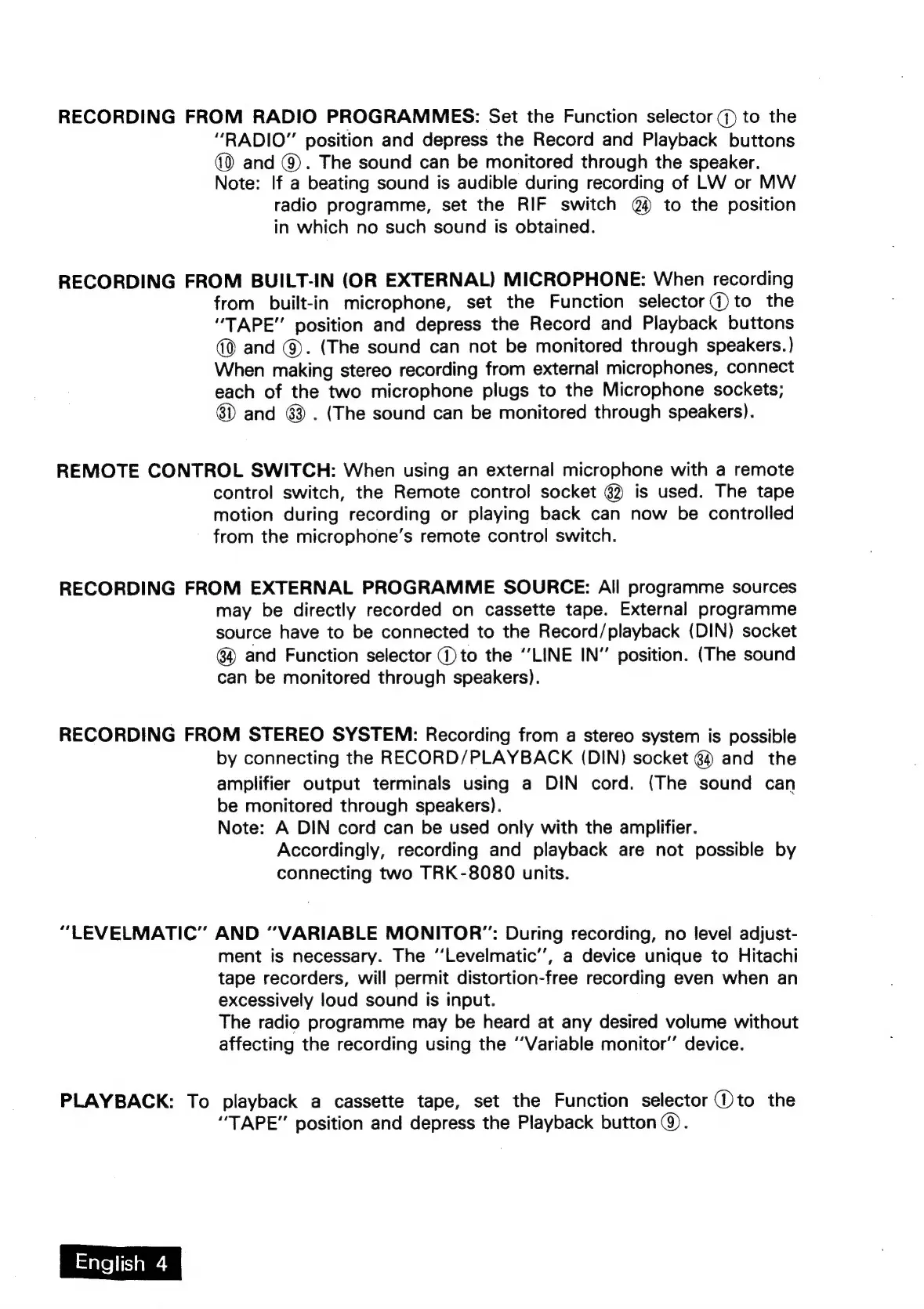 Hitachi TRK-8080E - Recording, Playback, and Controls; Recording Functions; Playback Operations; Levelmatic and Variable Monitor