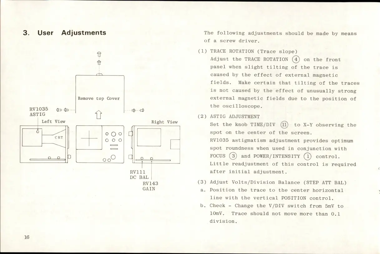 Hitachi V-151F - 3. User Adjustments; Trace Rotation Adjustment; Astigmatism Adjustment; Volts;Division Balance Adjustment