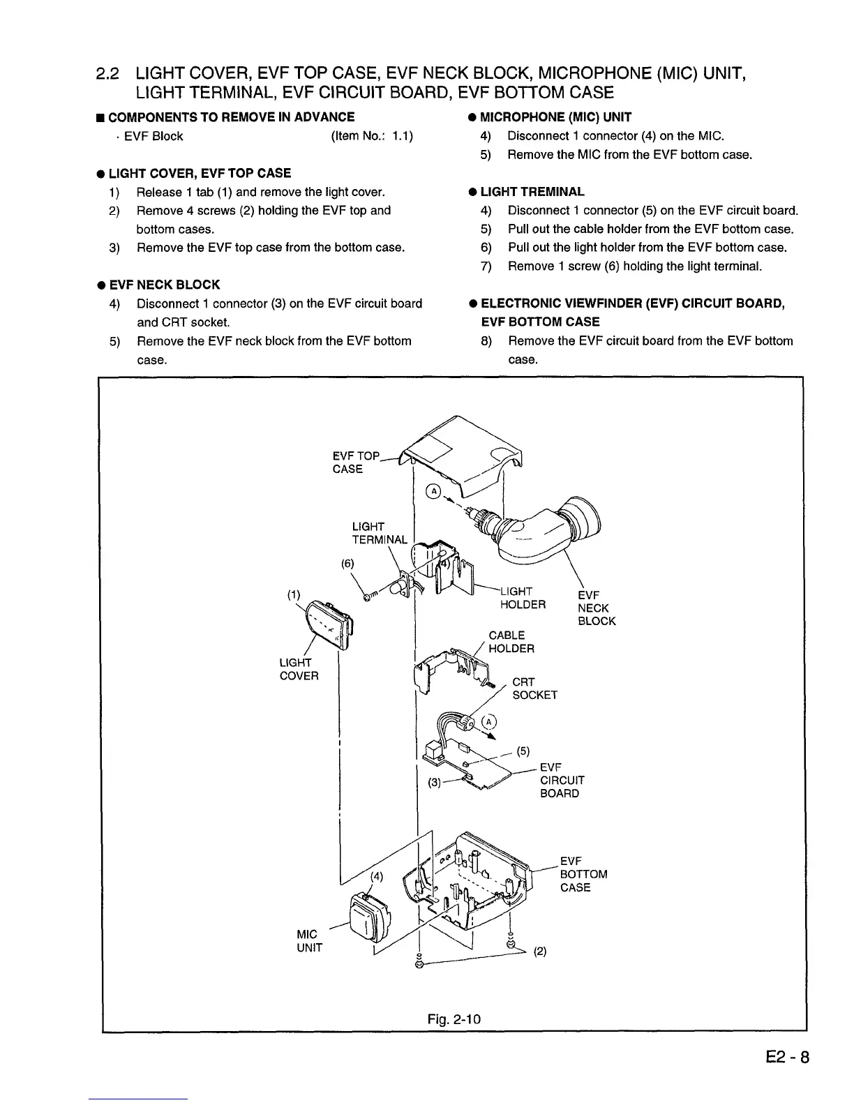 Hitachi VM-7380E - CHAPTER 2 DISASSEMBLY; 2.2 LIGHT COVER, EVF TOP CASE, EVF NECK BLOCK, MICROPHONE (MIC) UNIT, LIGHT TERMINAL, EVF CIRCUIT BOARD, EVF BOTTOM CASE; 2.3 EYE CUP, NECK TOP CASE, NECK BOTTOM CASE, MIRRER, EVF LENS, CRT FRAME, CRT