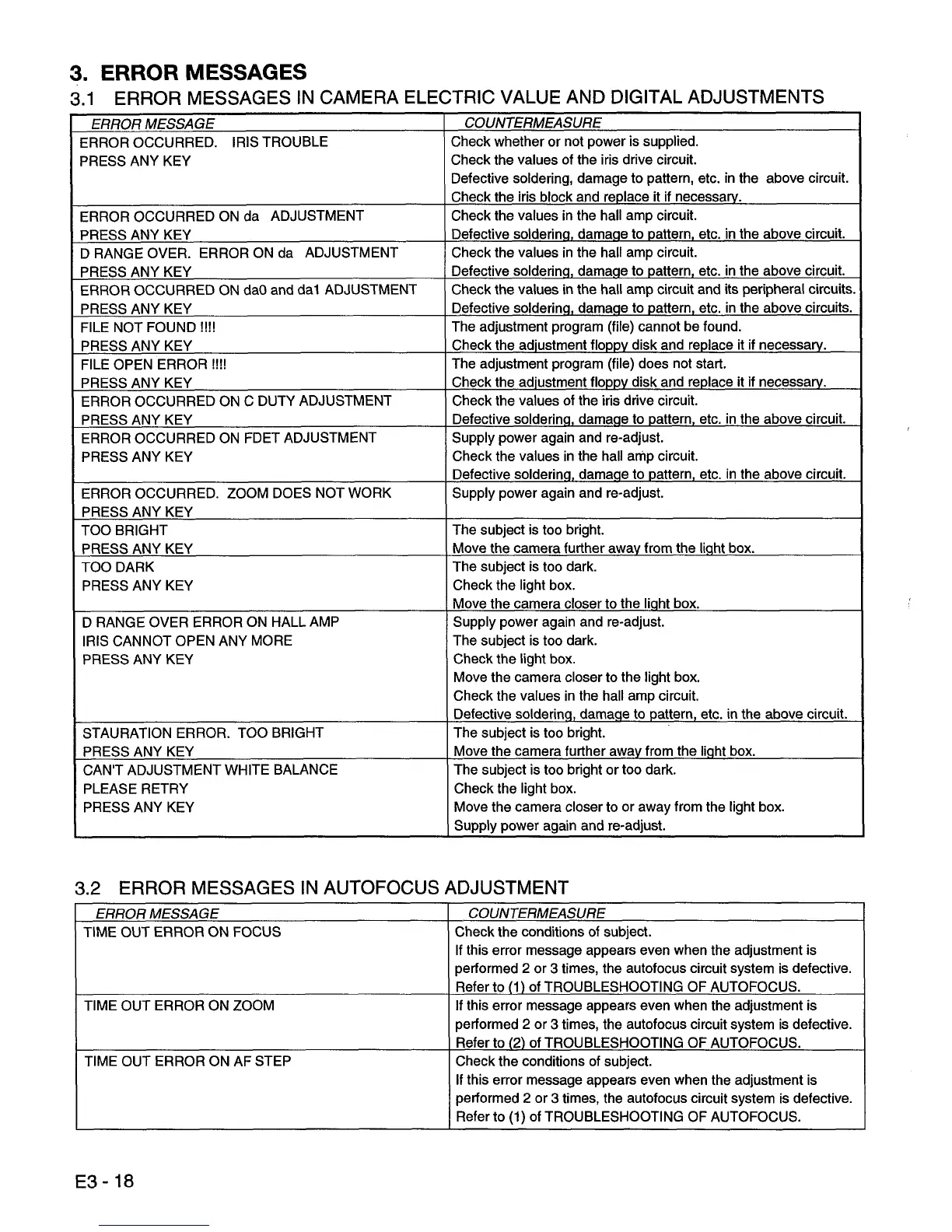 Hitachi VM-7380E - CHAPTER 3 ELECTRICAL ADJUSTMENT; 3. ERROR MESSAGES IN CAMERA ELECTRIC VALUE AND DIGITAL ADJUSTMENTS; 3.2 ERROR MESSAGES IN AUTOFOCUS ADJUSTMENT; 3.3 ERROR MESSAGES IN SPOT NOISE ADJUSTMENT