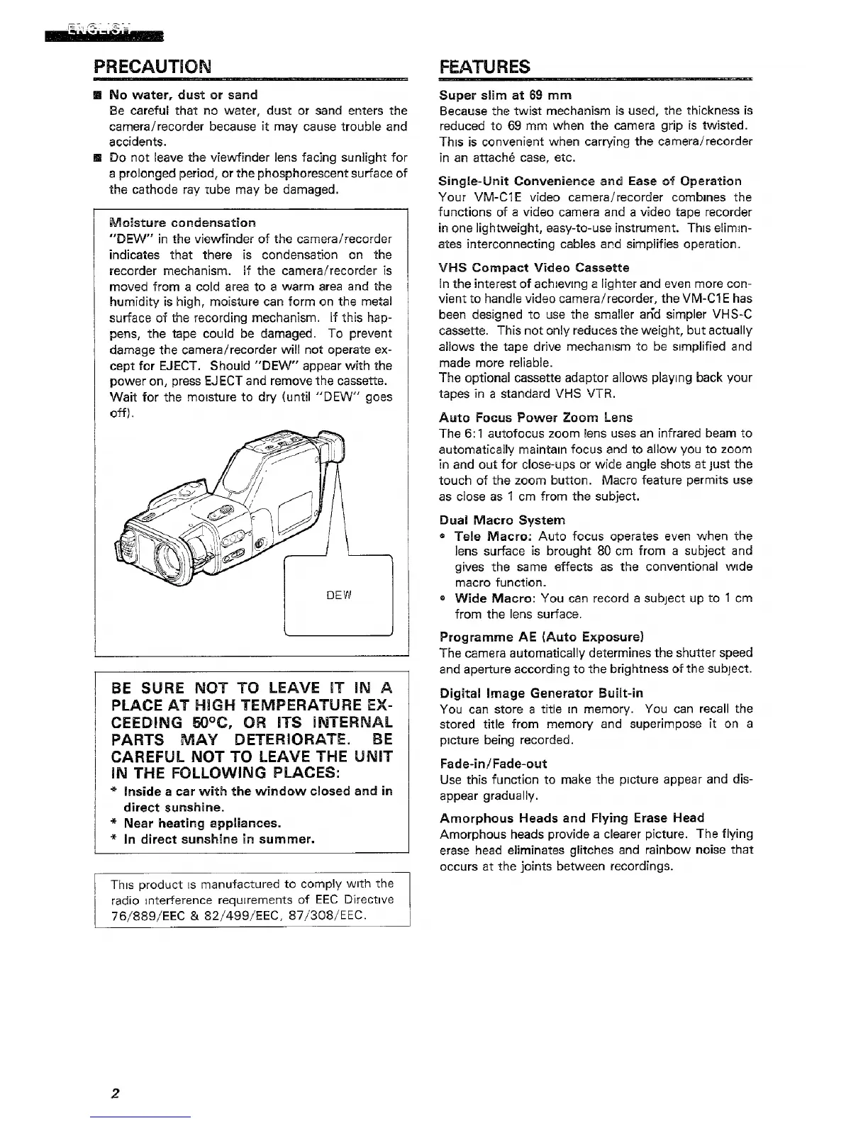 Hitachi VM-C1E - Precautions; Features; Moisture Condensation; No Water, Dust or Sand
