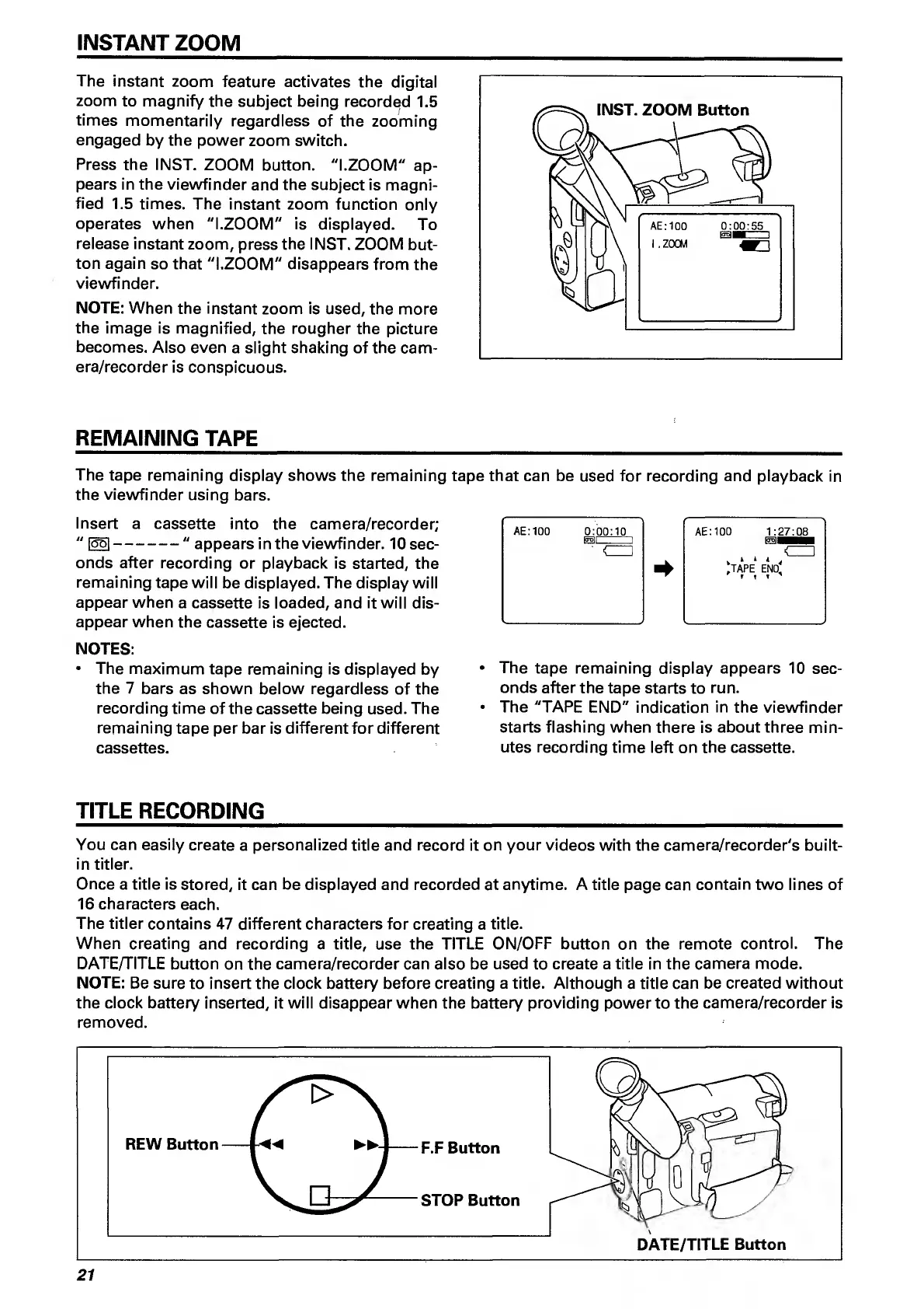 Hitachi VM-E110E - Instant Zoom.21; Remaining Tape.21; Title Recording