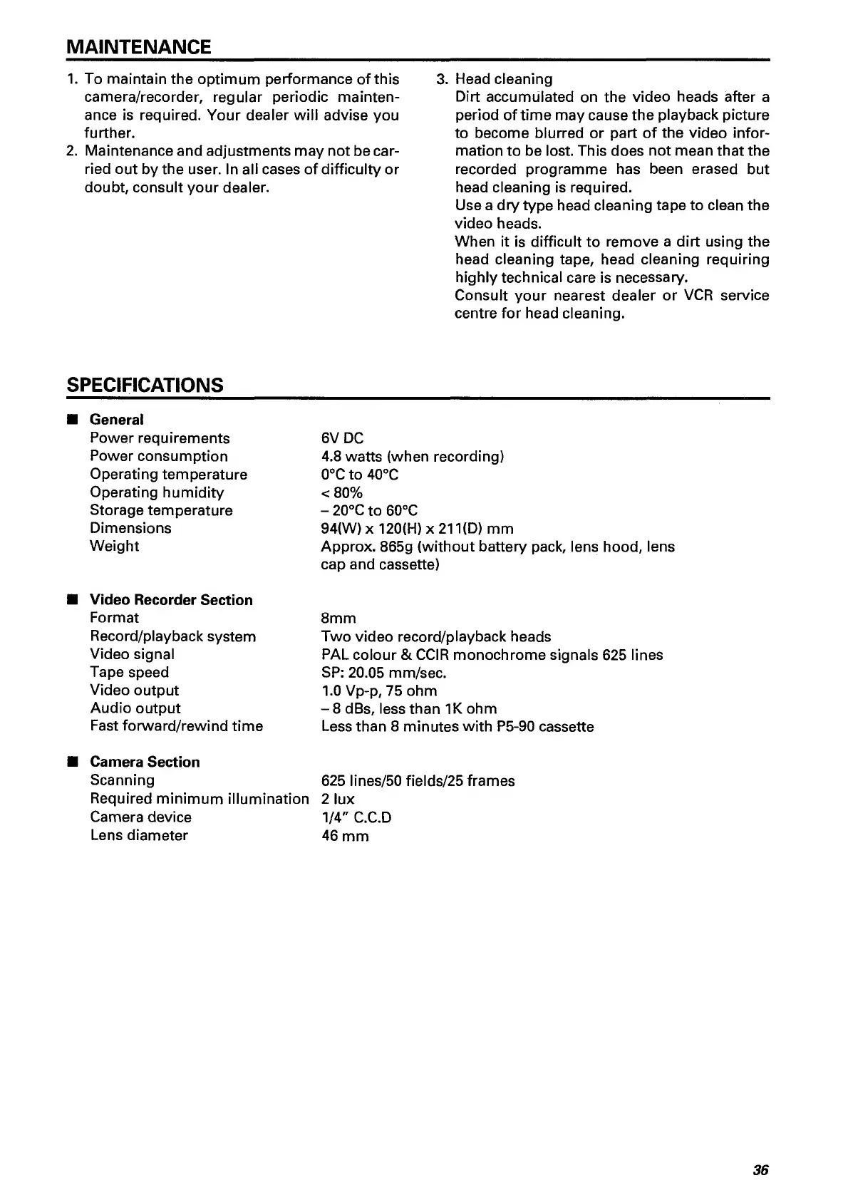 Hitachi VM-E110E - Maintenance.36; Specifications