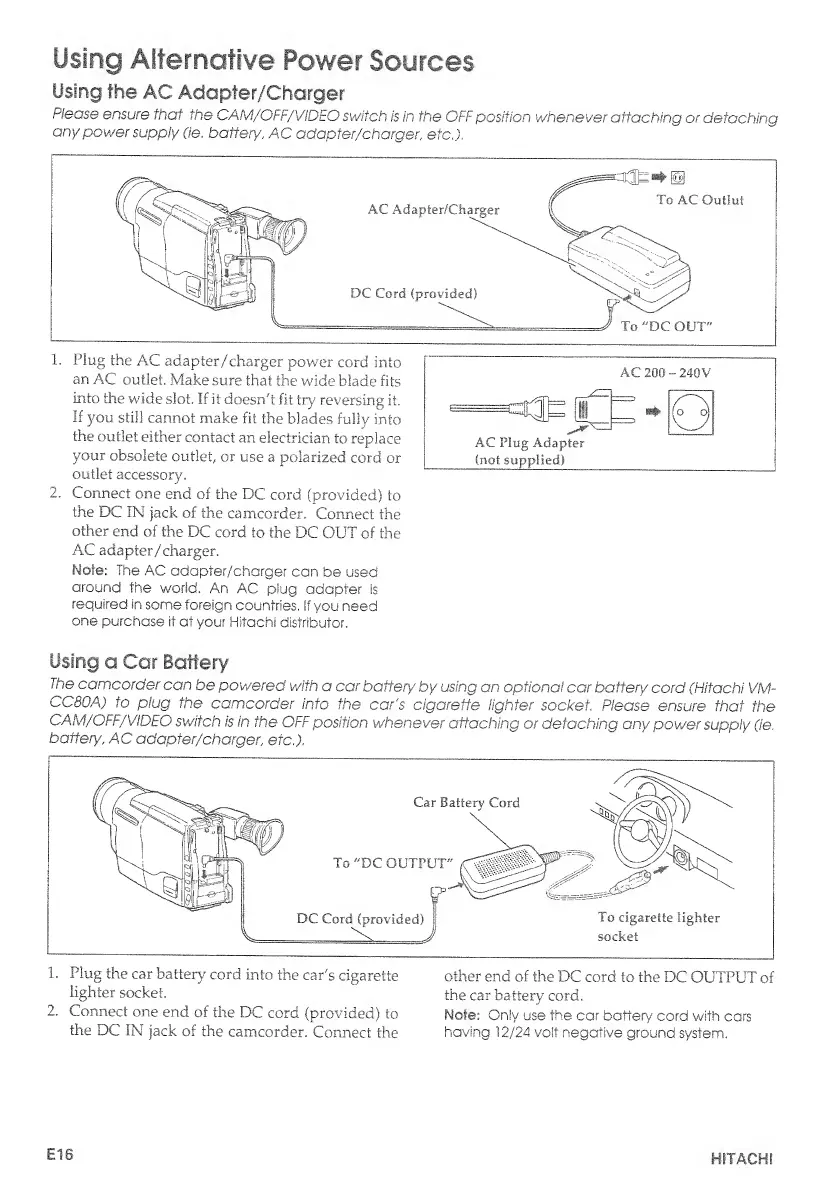 Hitachi VM-E530A - Using Alternative Power Sources; Using the AC Adapter;Charger; Using a Car Battery