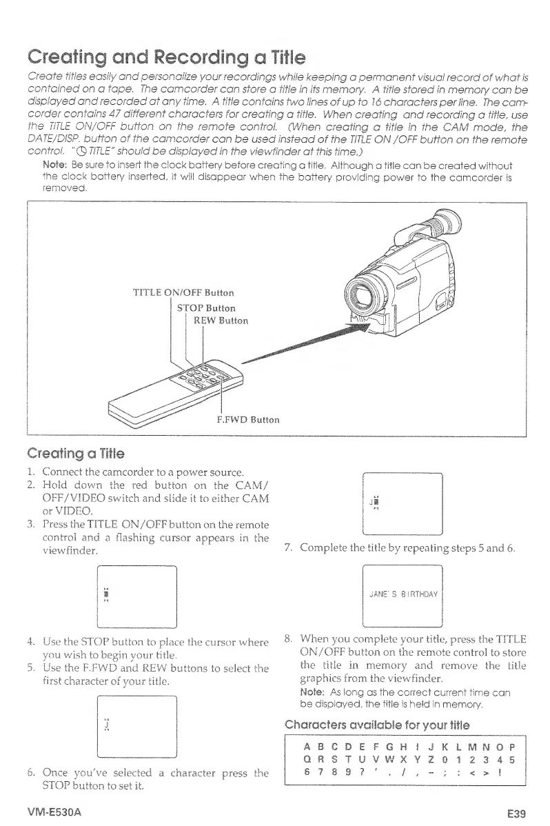 Hitachi VM-E530A - Creating and Recording a Title; Creating a Title; Characters Available for Your Title