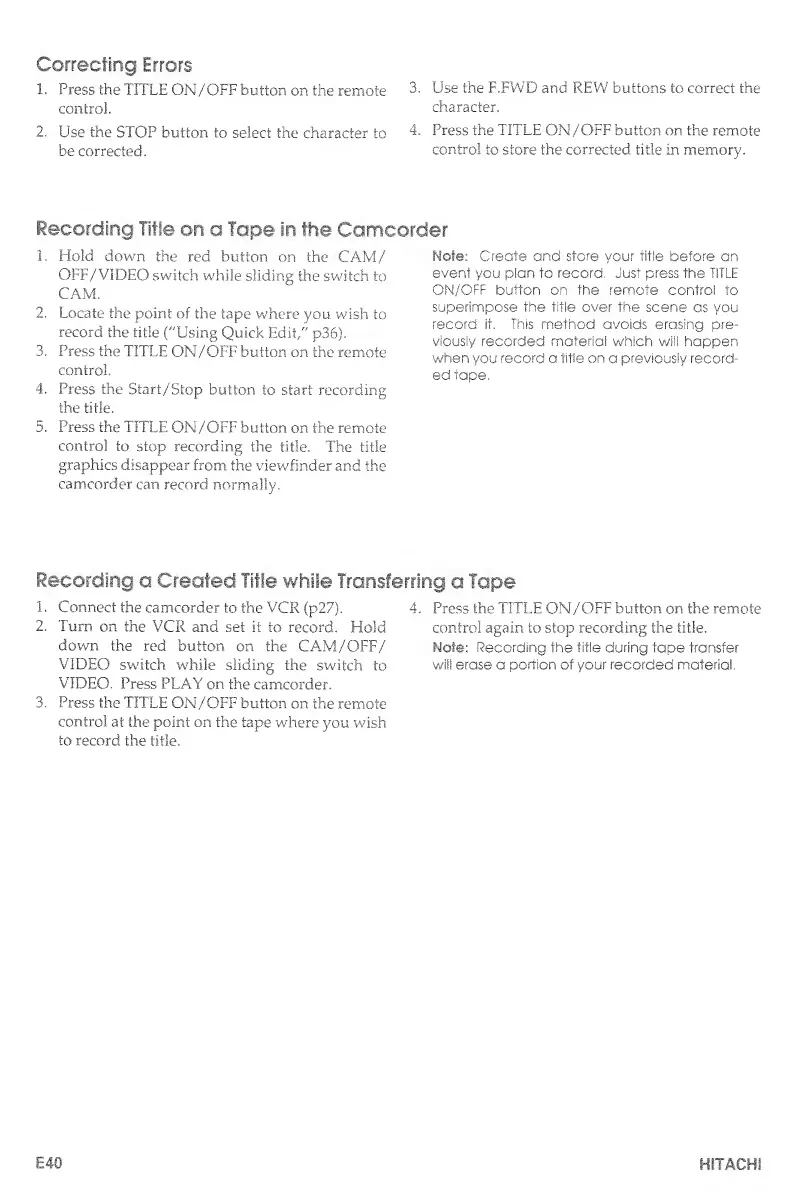 Hitachi VM-E530A - Correcting Errors; Recording Title on a Tape in the Camcorder; Recording a Created Title While Transferring a Tape