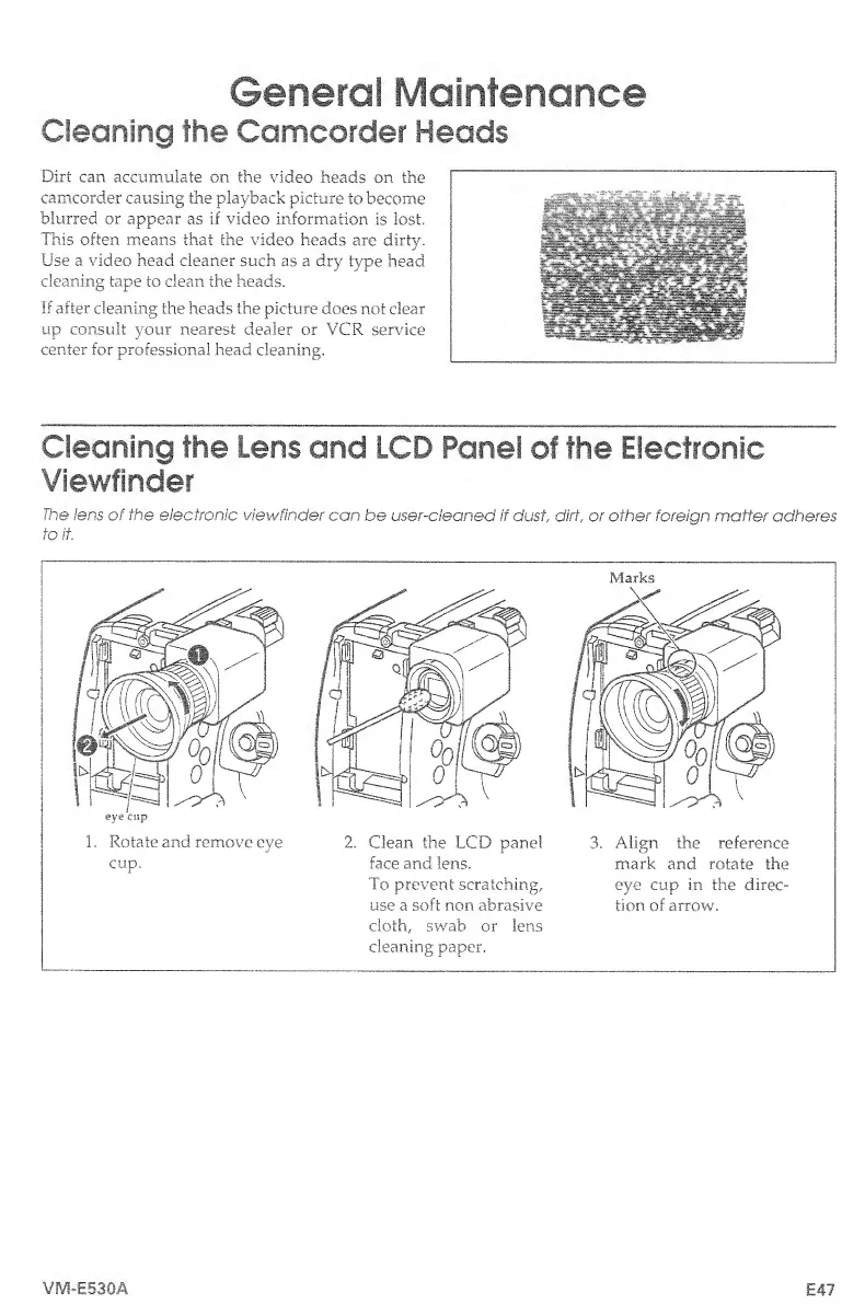 Hitachi VM-E530A - Cleaning the Camcorder Heads; Cleaning the Lees and LCD Panel of the Electronic Viewfinder