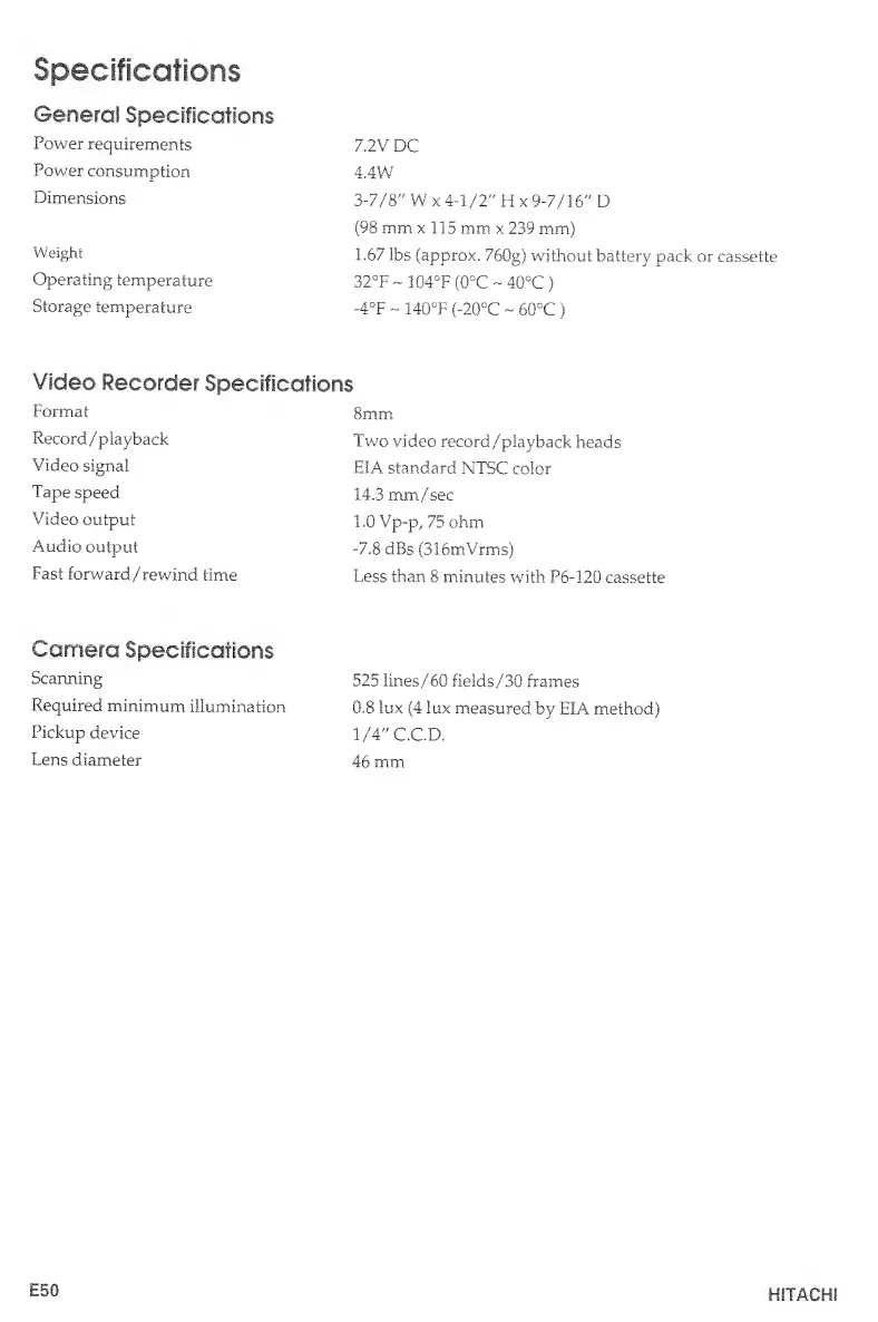 Hitachi VM-E530A - Specifications; General Specifications; Video Recorder Specifications; Camera Specifications