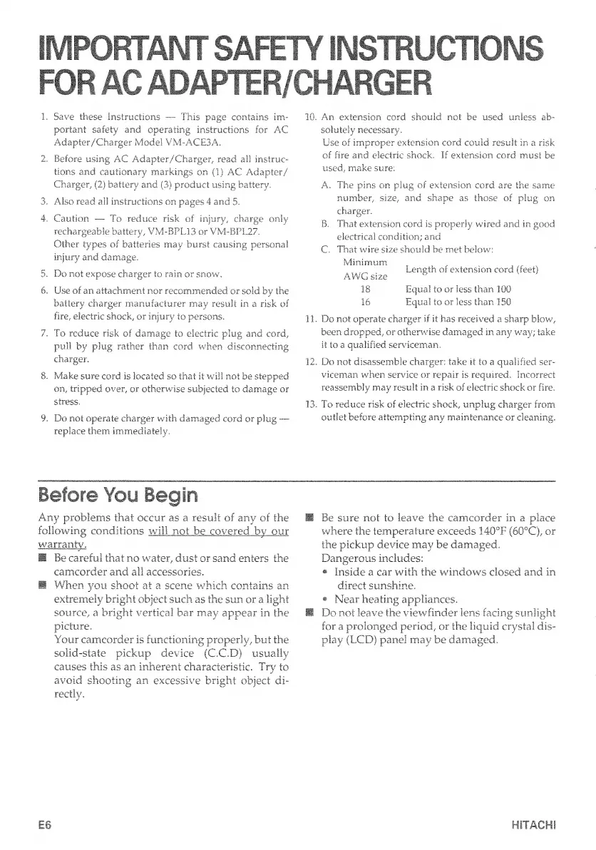 Hitachi VM-E530A - Important Safety Instructions for AC Adapter;Charger; Before You Begin