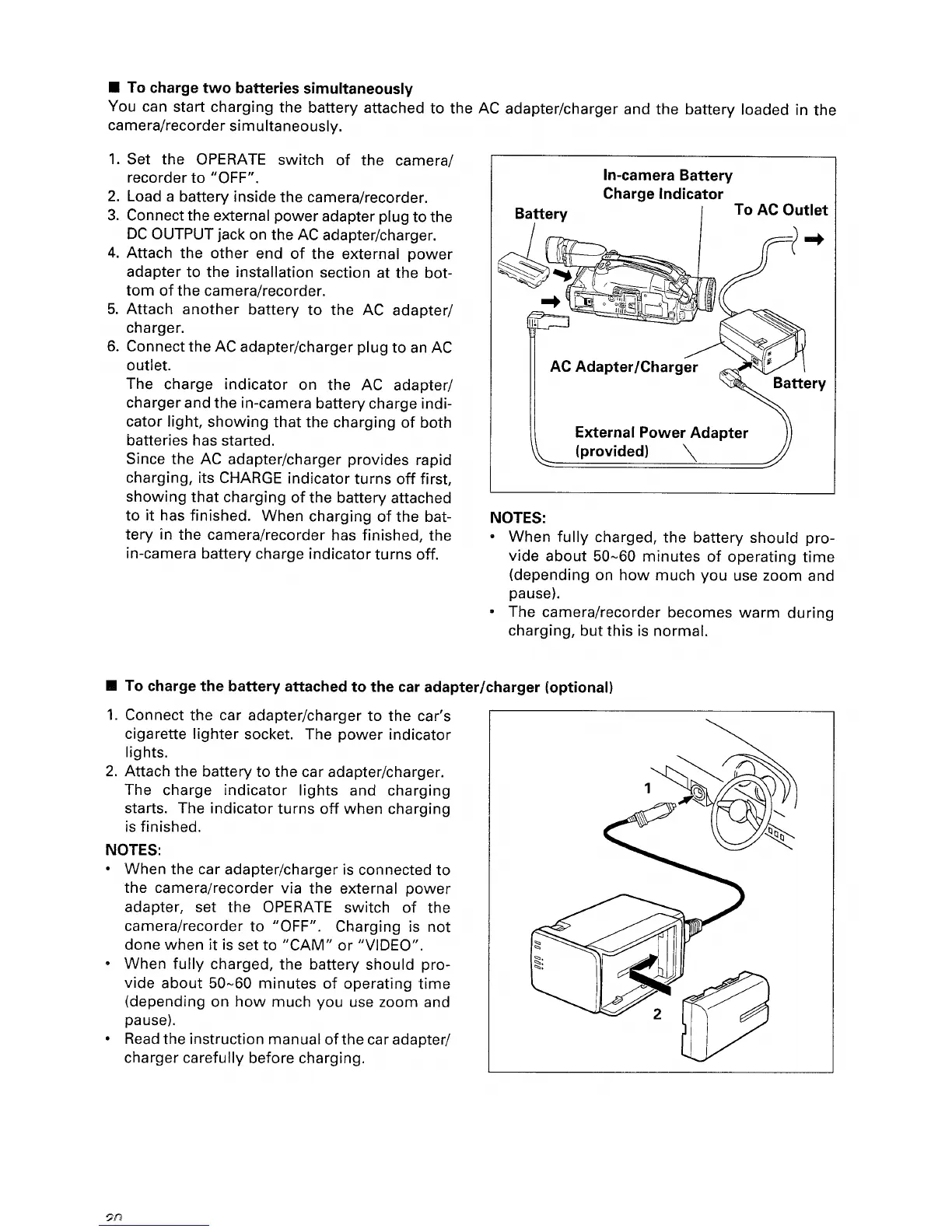 Hitachi VM-H70E - To Charge Two Batteries Simaltaneously; To Charge the Battery Attached to the Car Adapter;Charger; In-Camera Battery