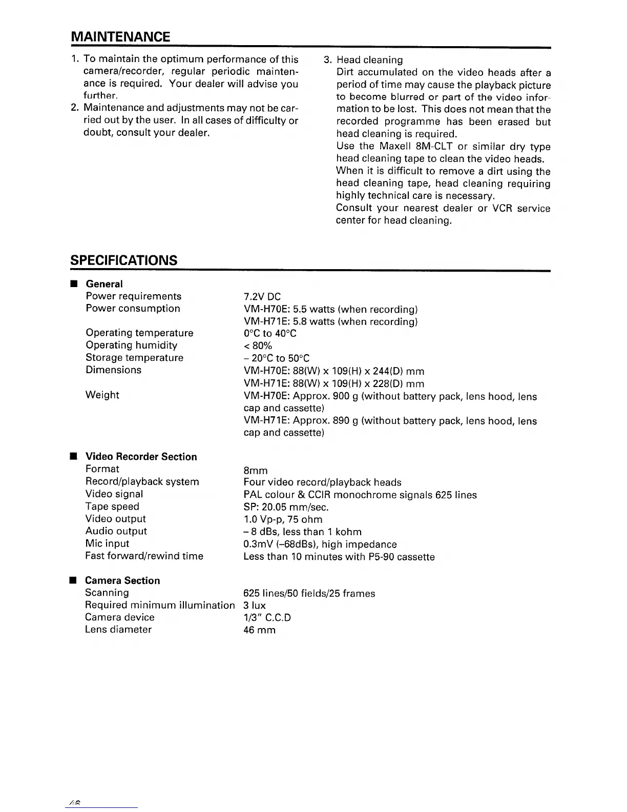 Hitachi VM-H70E - Specifications; Technical Data; Maintenance Recommendations
