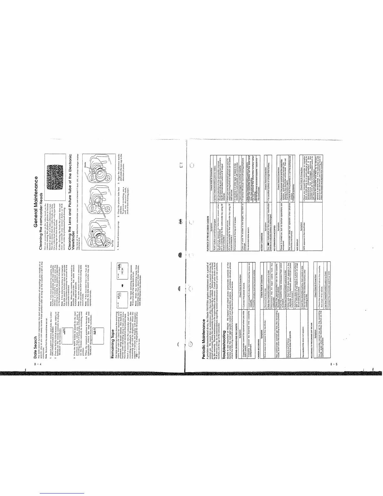 Hitachi VM-H710A - Maintenance; Troubleshooting; Cleaning the Camcorder Heads; Cleaning the Lens and Picture Tube of the Electronic Viewfinder