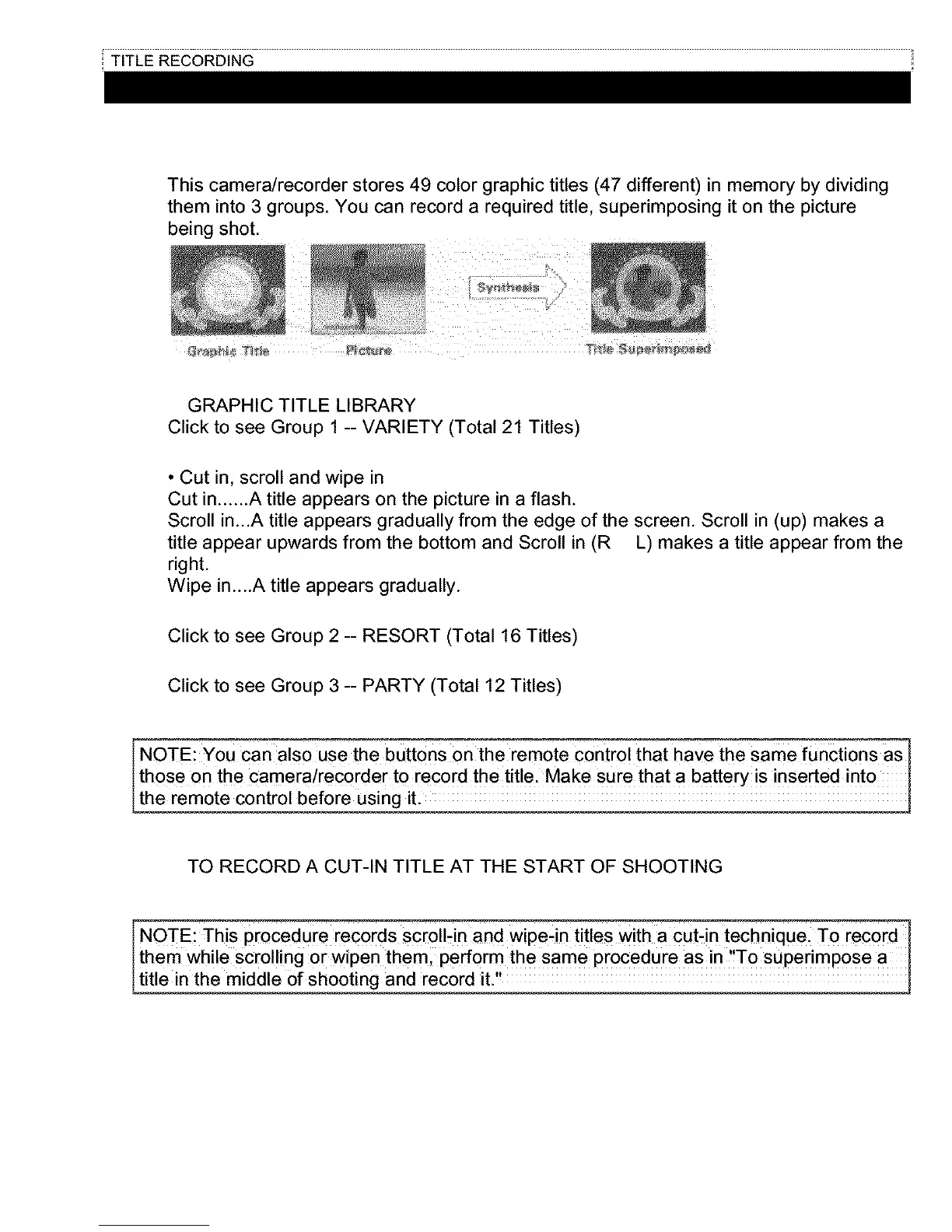 This camera/recorder stores 49 color graphic titles (47 different) in memory by dividing