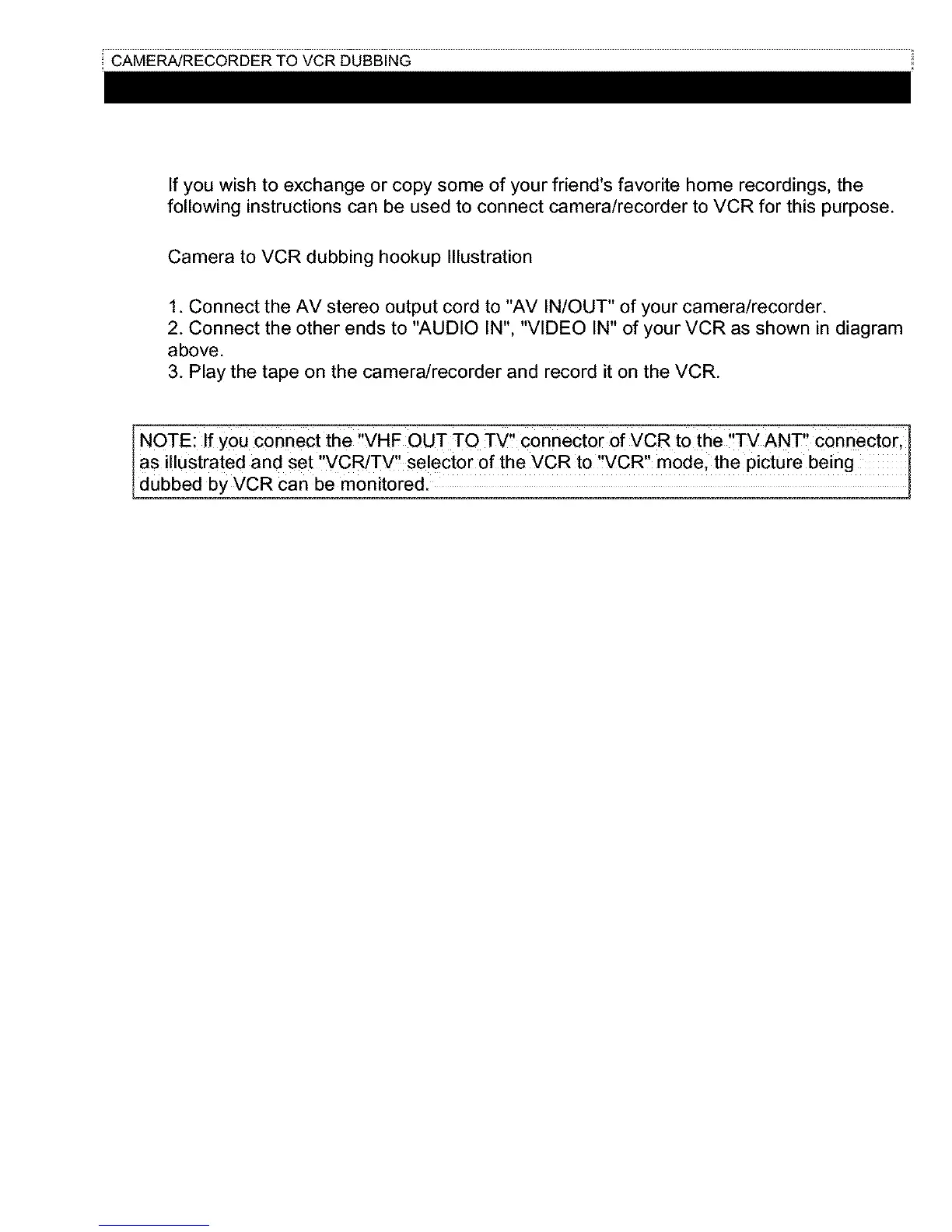 following instructions can be used to connect camera/recorder to VCR for this purpose.