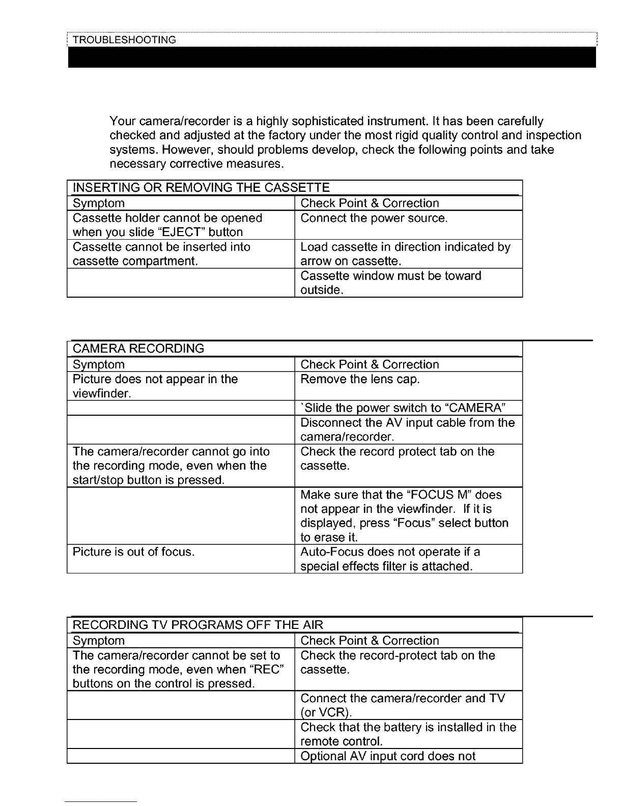 Your camera/recorder is a highly sophisticated instrument. It has been carefully