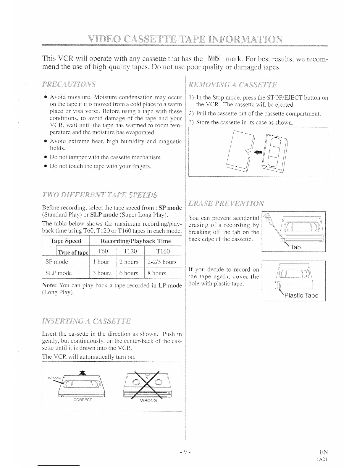 Hitachi VT-FX665A - Video Cassette Tape Information; Two Different Tape Speeds; Removing Cassette; Inserting a Cassette