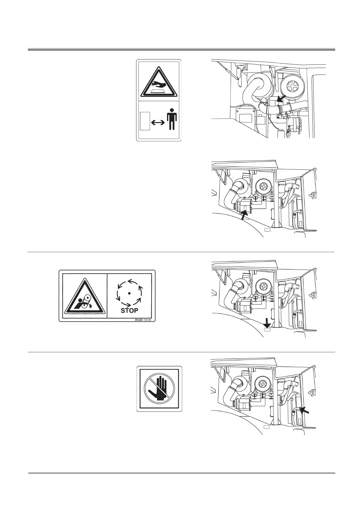 Sign indicartes a hazard of rotating parts, such as belt. Turn