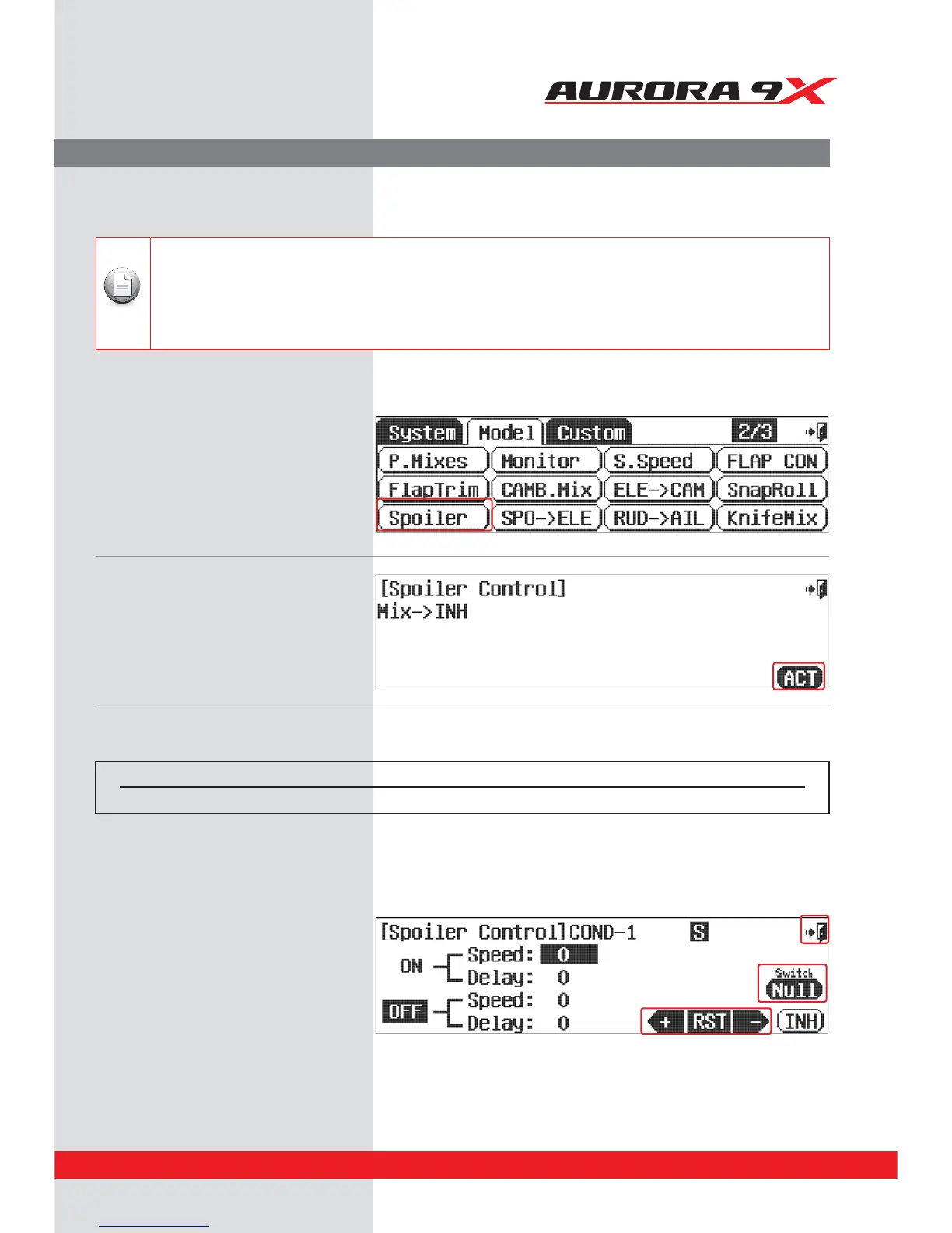 e. The Spoiler can mix with other Functions. Put the value of Speed and Delay by using +RST - icon and then proceed to set on the O position.