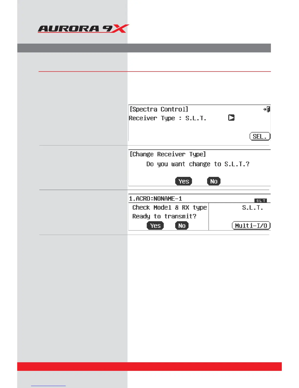 The following procedure is for binding typical SLT receivers to the Aurora 9X. These methods may vary from manufacturer to manufac-