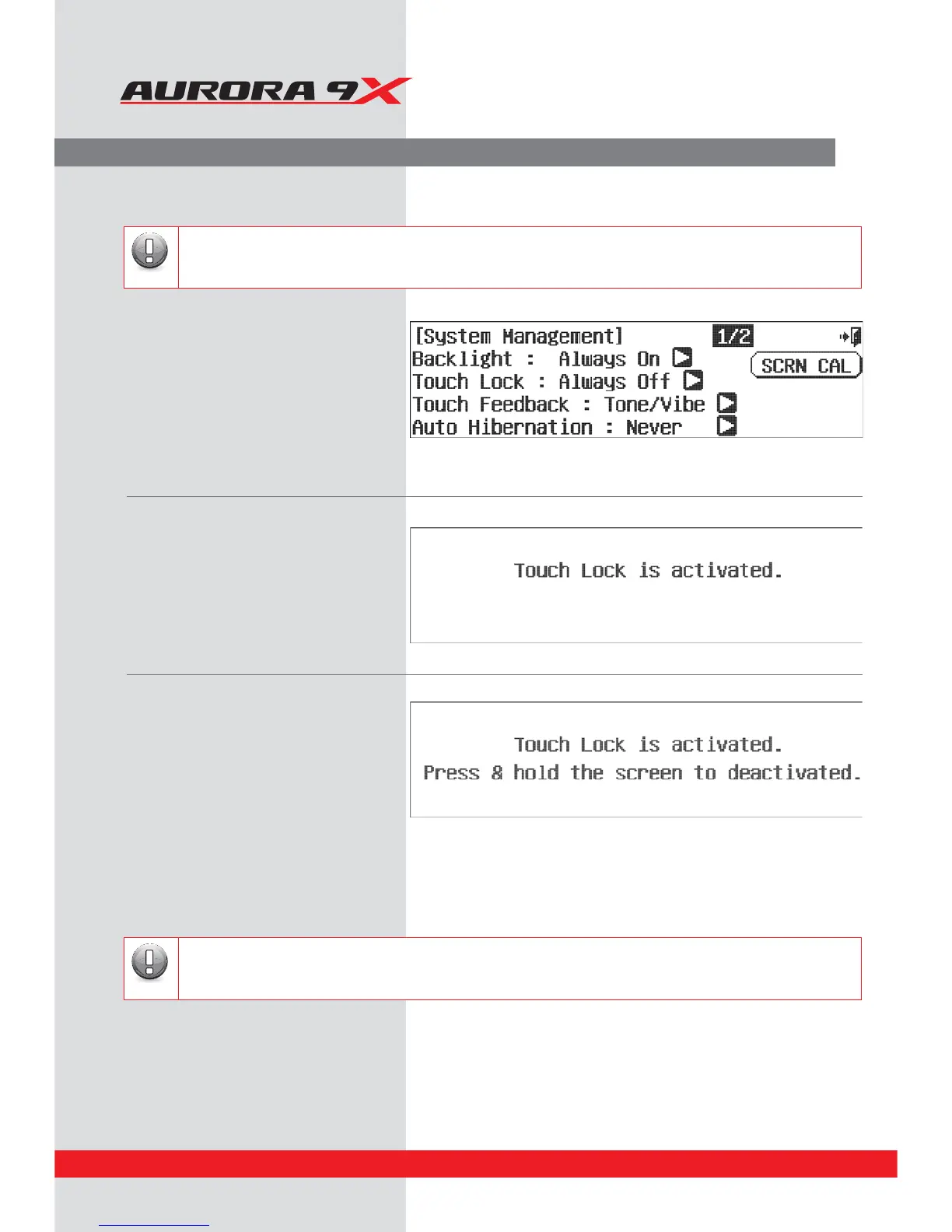 The Touch Screen Lock function is not active if the Aurora 9X is not transmitting.