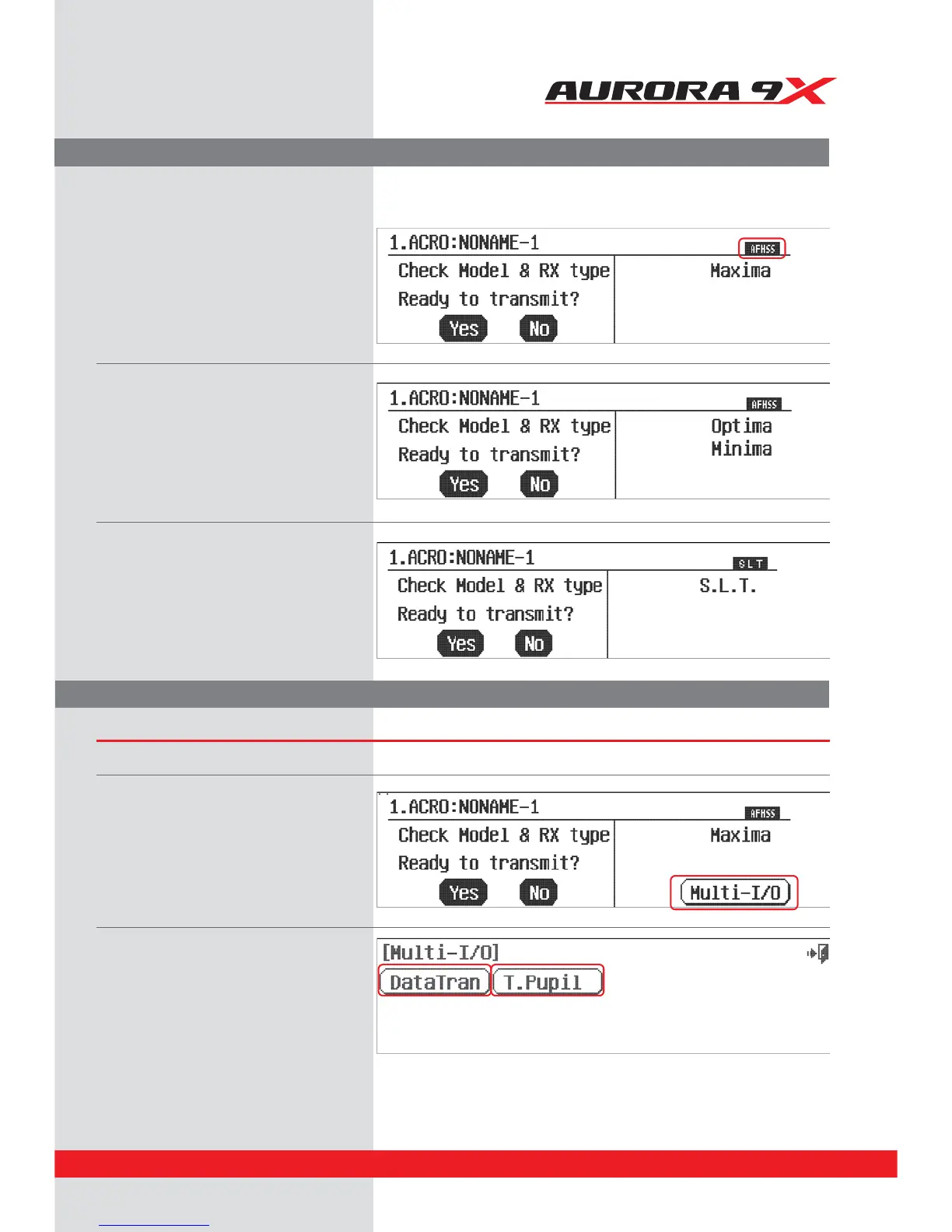 The Aurora 9X displays a Multi-I/O format that is shown in the rst screen of all AFHSS and SLT modes.