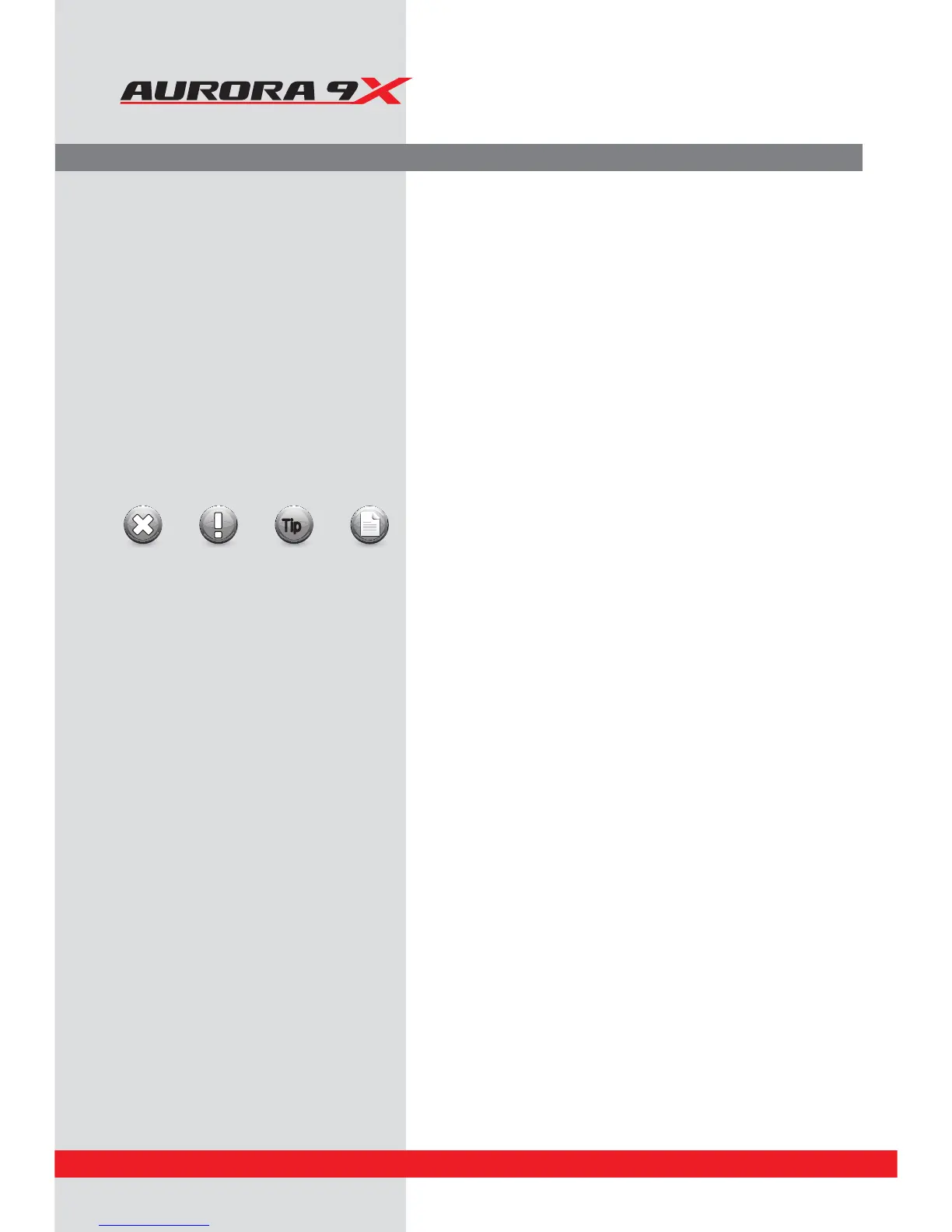 Warning: This icon alerts you to warnings that relate to your safety and to help ward against damage to the Aurora 9X.