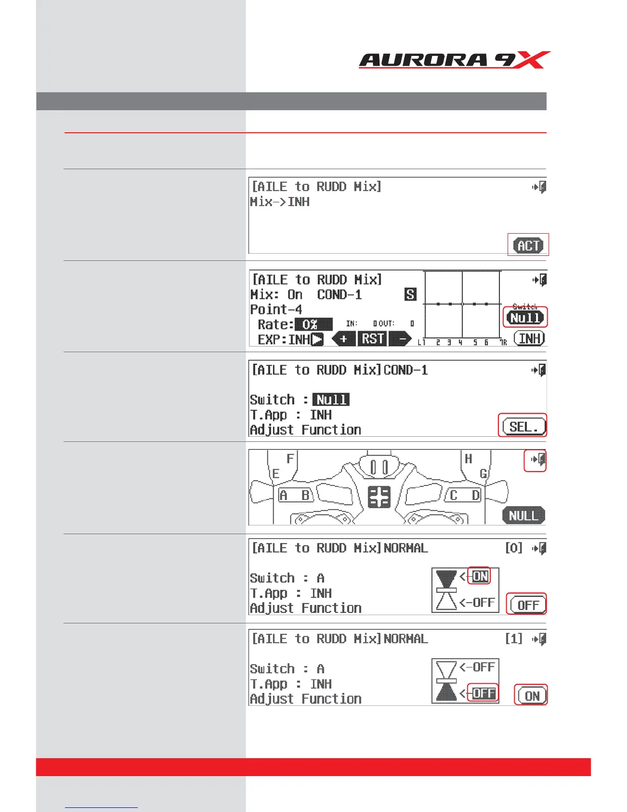 We will use the aileron to rudder mix to set up a two position switch on or o function.