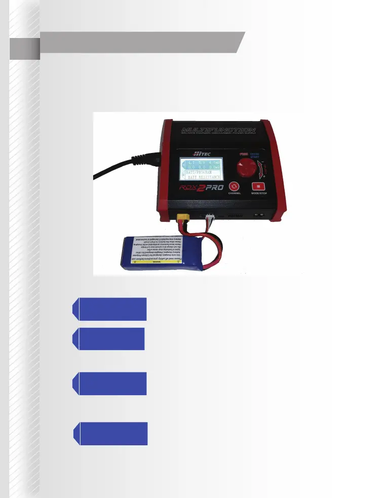 via the charger’s main battery lead to the battery socket; and the balance wires to the balance socket