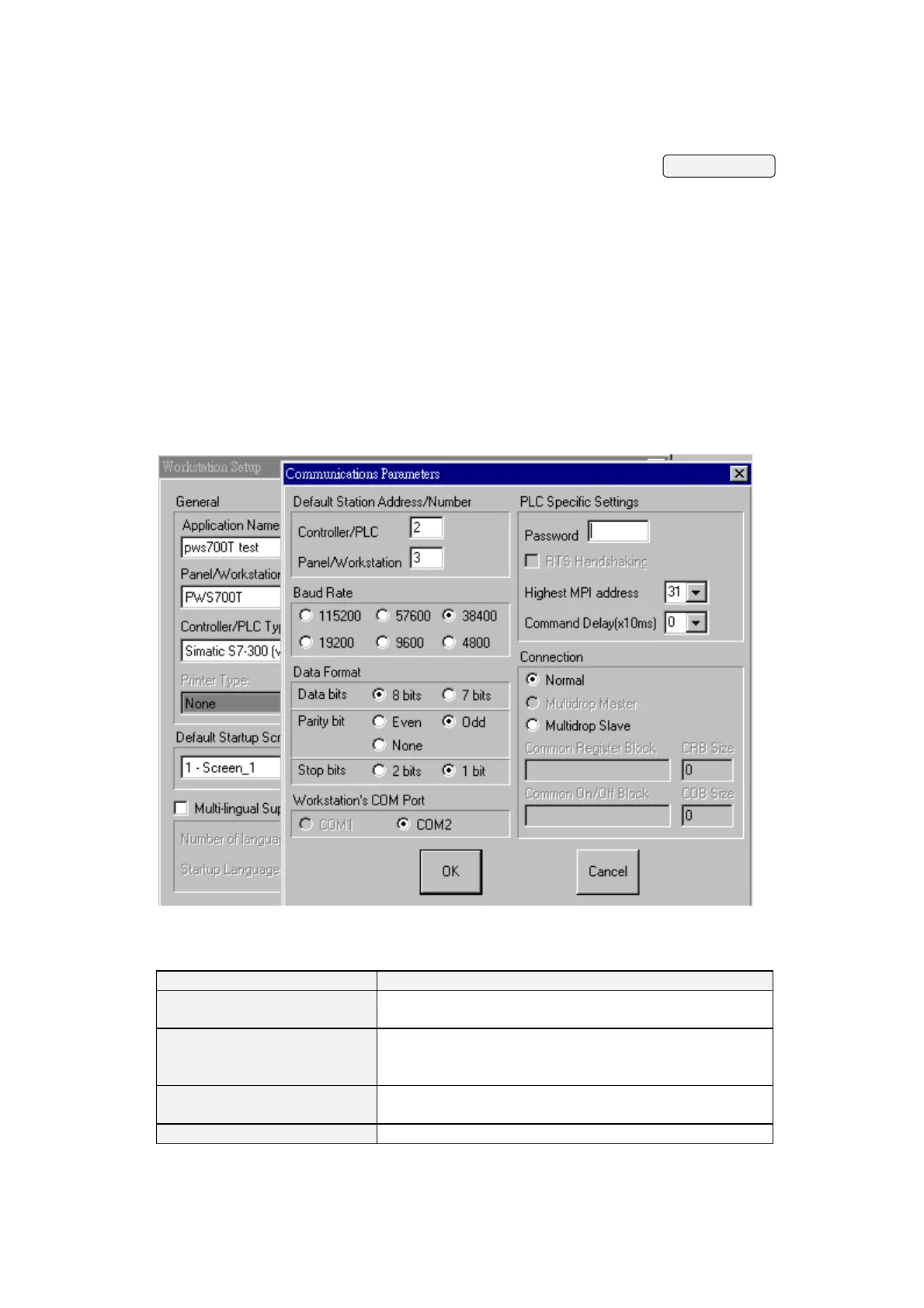 Communication Parameter dialog box appears with the