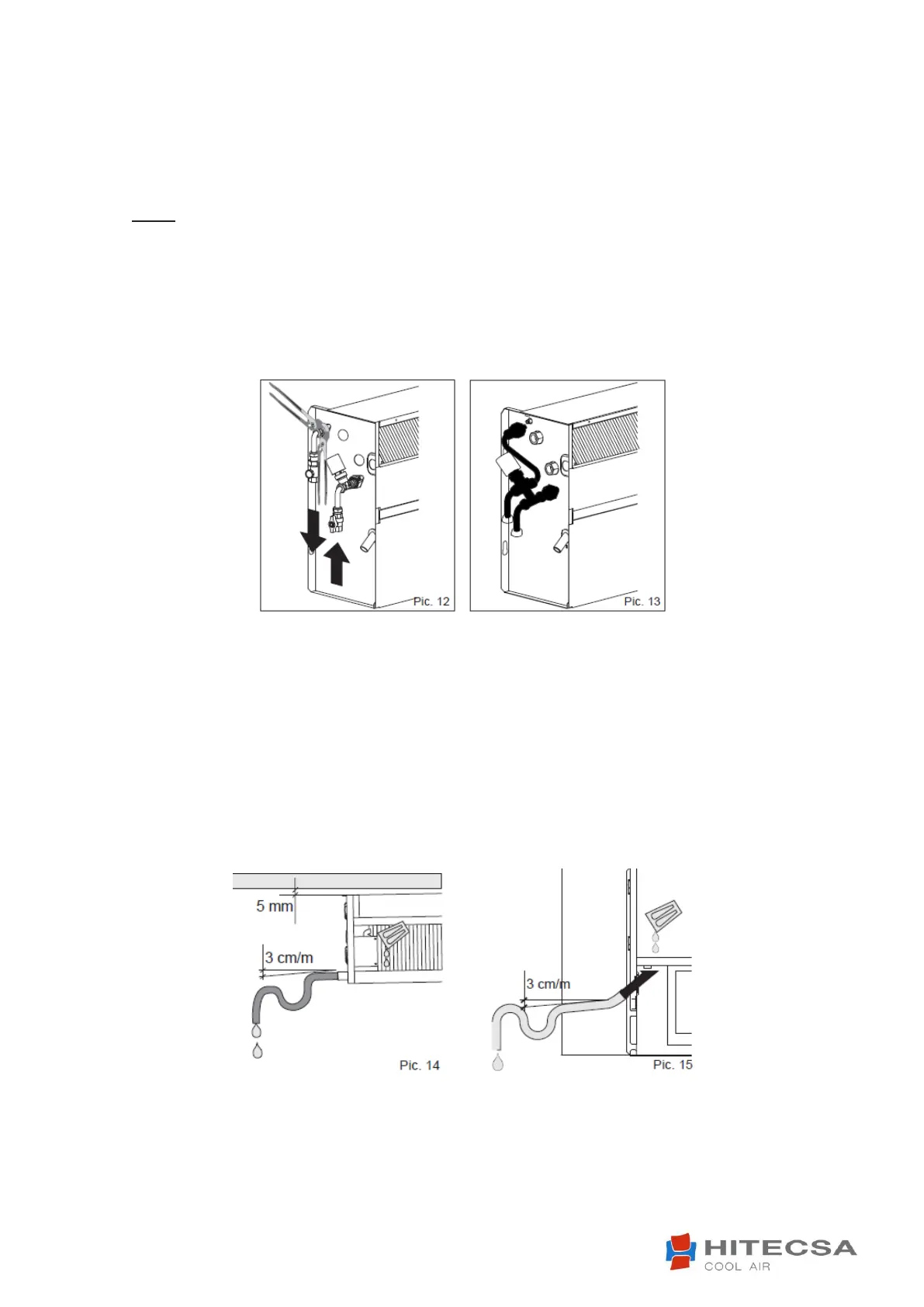 The condensate drain pipe should slope downwards by at least 3 cm/m and should not have ascending or