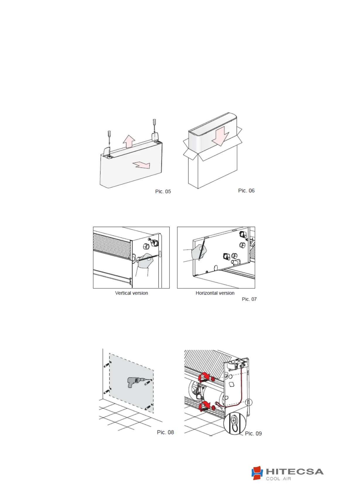 and the water connections. Remove the two screws fixing the housing to the fan coil load-bearing