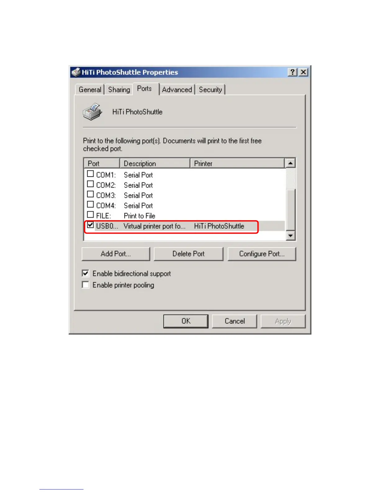 HiTi printer will create “virtual Printer port” for printing through USB. All you